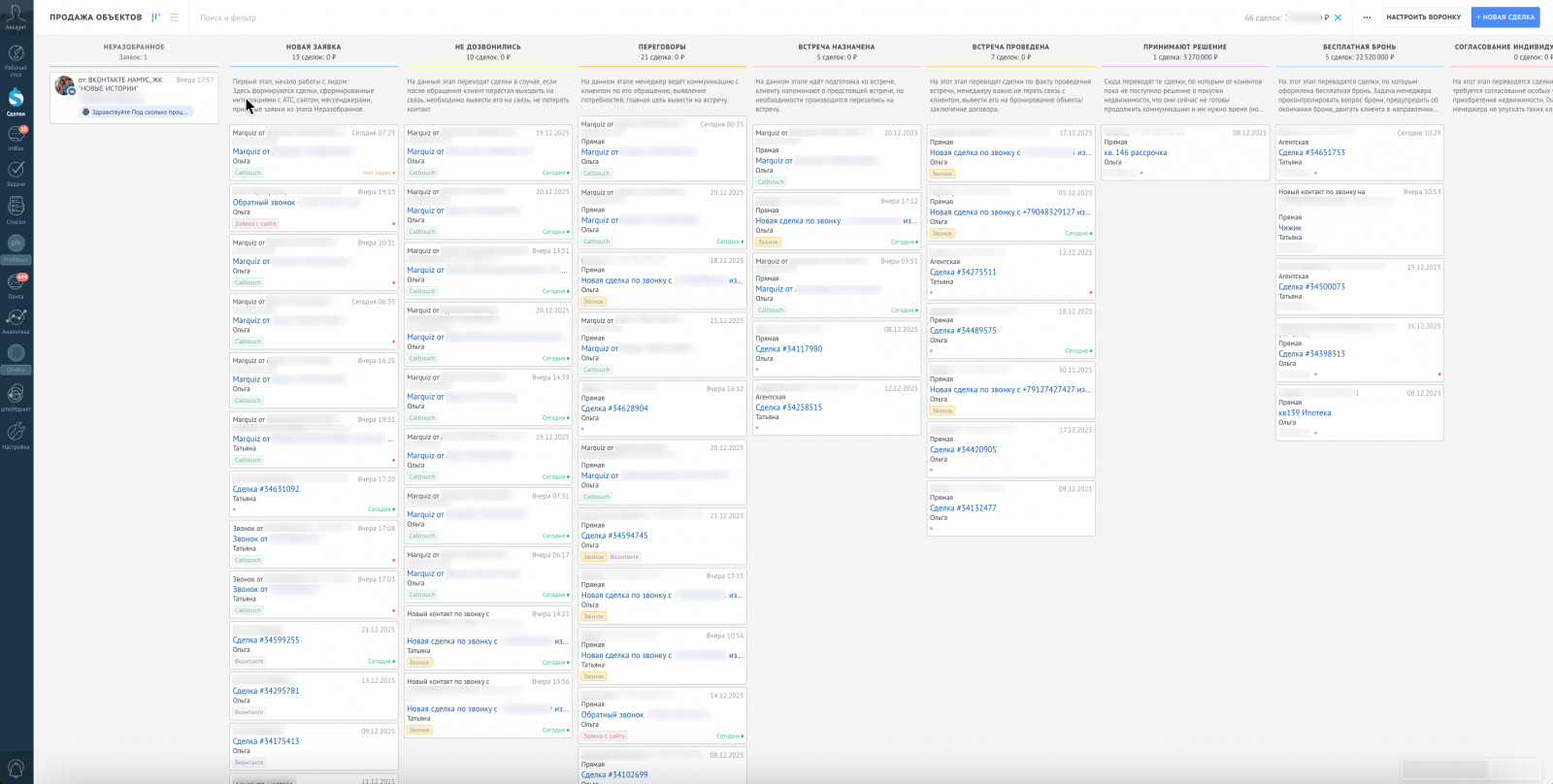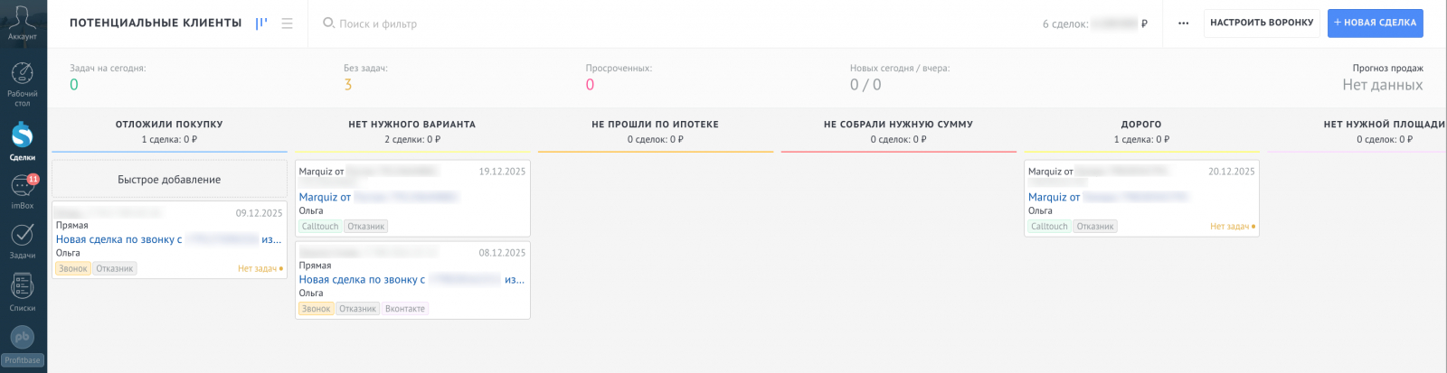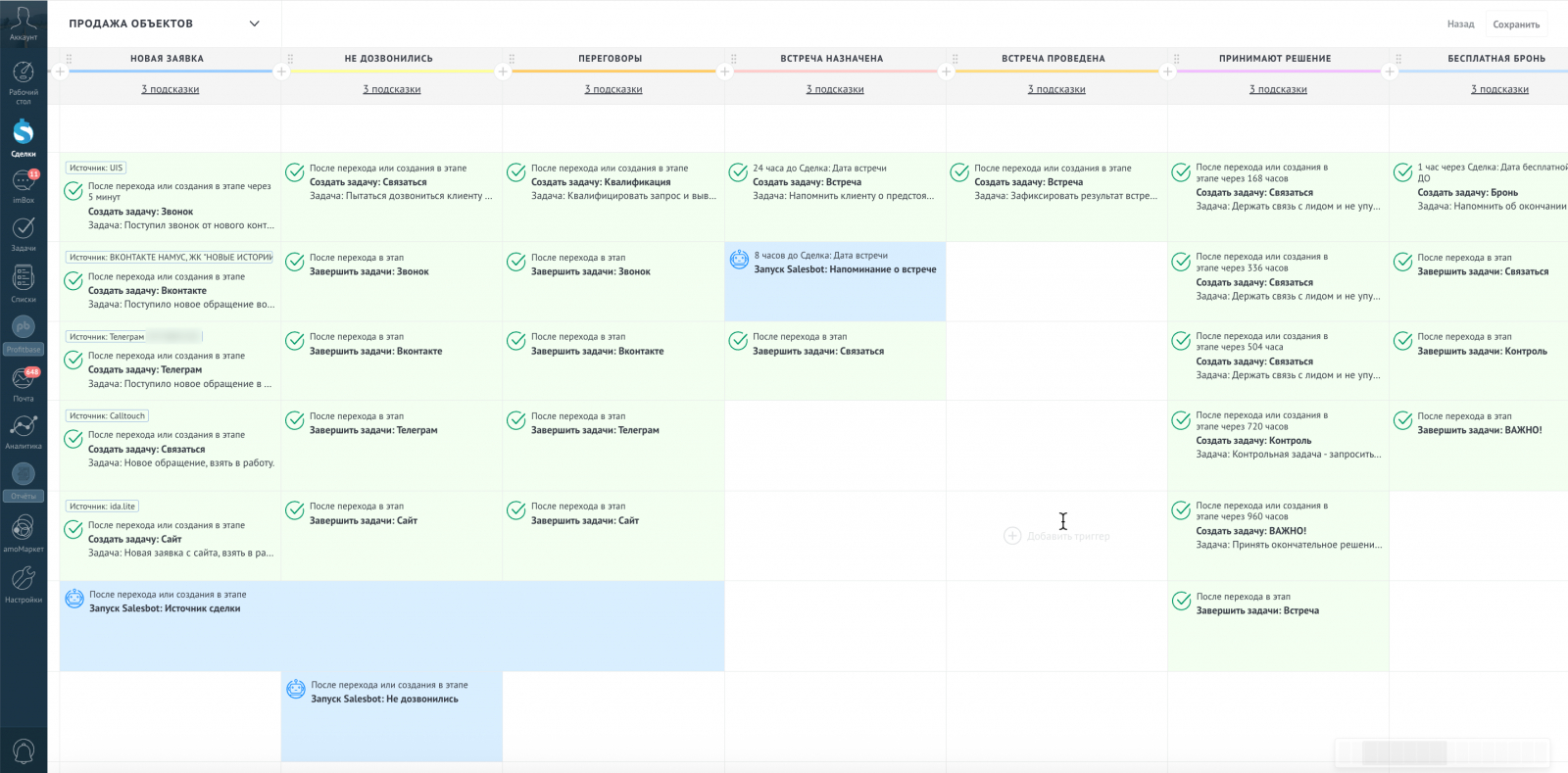 - Воронка отложенного спроса: в недвижимости это «золотая жила». Сюда попадают те, кто ждет старта новых очередей или копит на первый взнос. Теперь менеджеры не забывают про них, а система напоминает о необходимости касания.