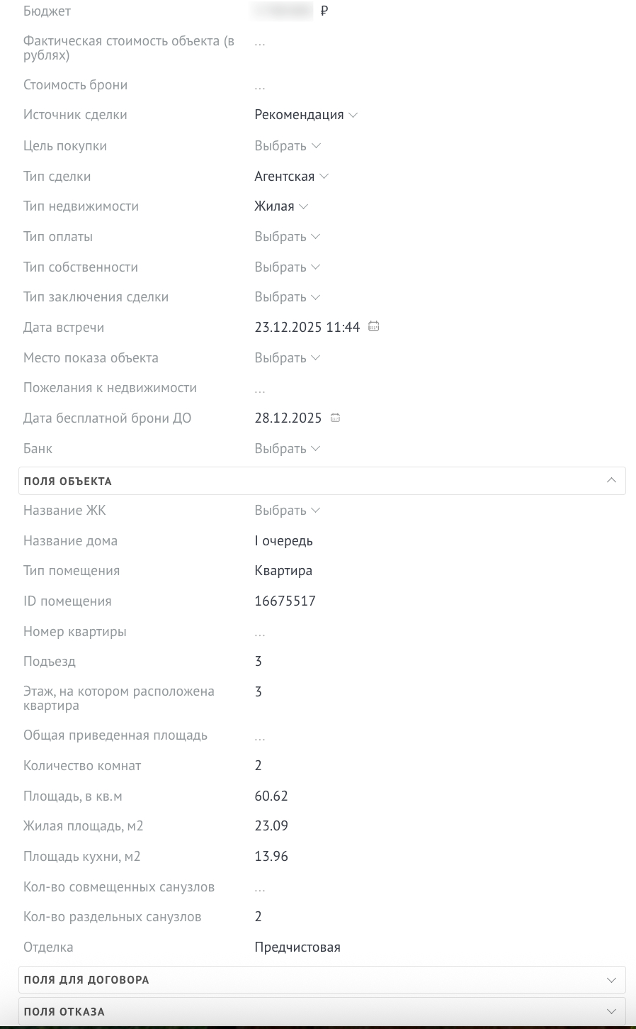 Карточку сделки мы превратили в «паспорт клиента»: теперь там хранятся не только контакты, но и площадь объекта, его стоимость, этаж и источник заявки.