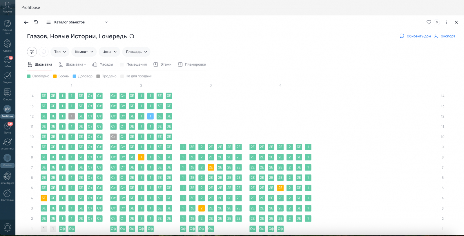 - Актуальная шахматка: менеджер прямо в CRM видит, какие квартиры свободны, какие в брони, а какие проданы.