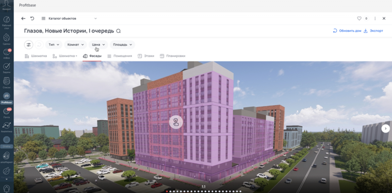 - Автоматизация данных: при выборе квартиры в Profitbase есть все параметры (цена, м²) мгновенно появляются в amoCRM.