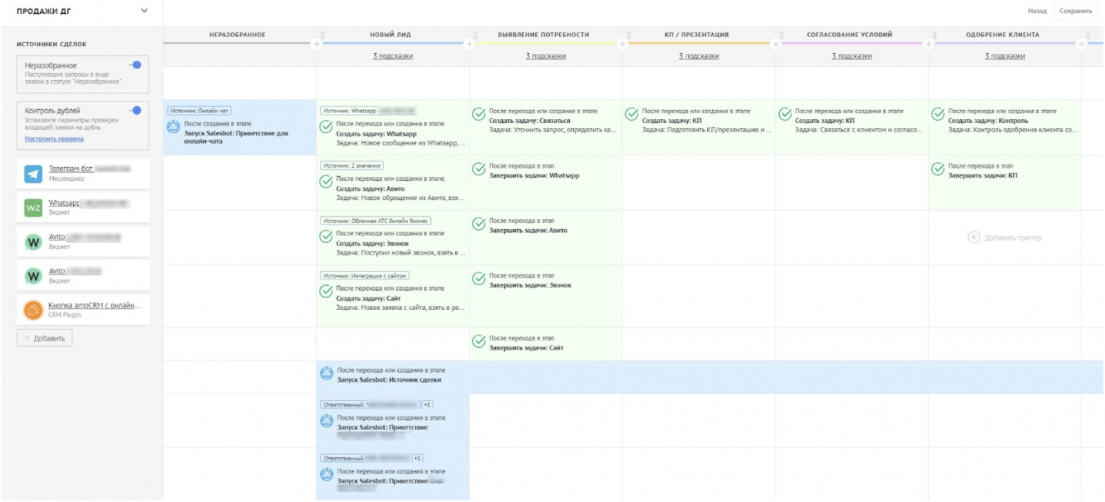 Разобрали бизнес-процессы компании и способы сегментации полученных заявок, в частности, разделение сделок на прямой договор и лизинг. Также на этом этапе спланировали интеграции amoCRM с основными каналами привлечения клиентов.