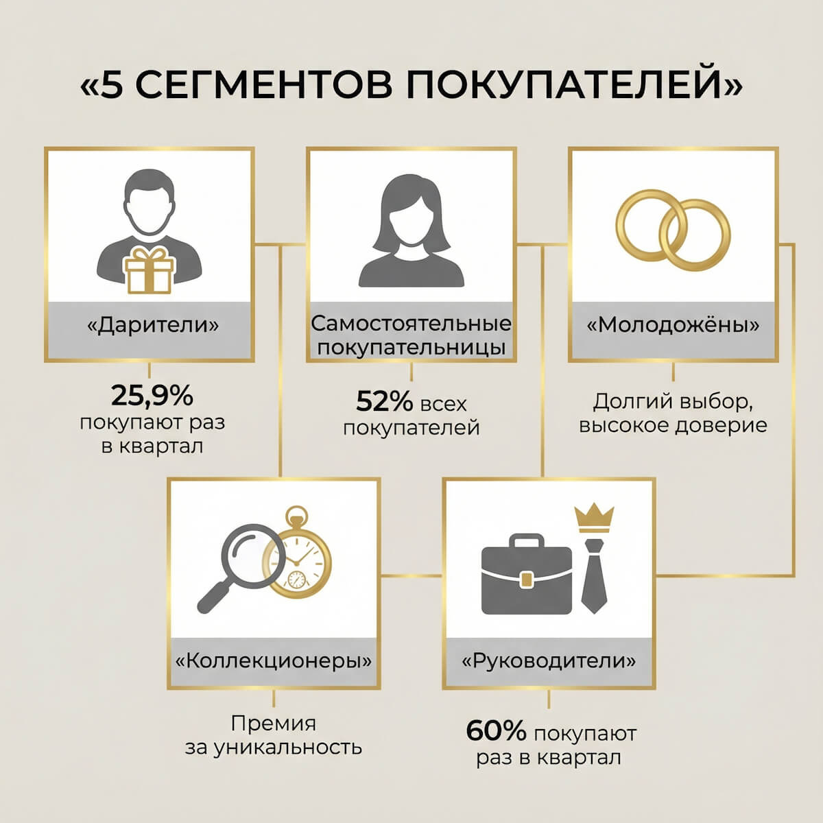 Целевая аудитория ювелирного бренда неоднородна. Исследования показывают, что российский ювелирный рынок можно разделить на несколько ключевых сегментов, каждый из которых требует индивидуального подхода.
