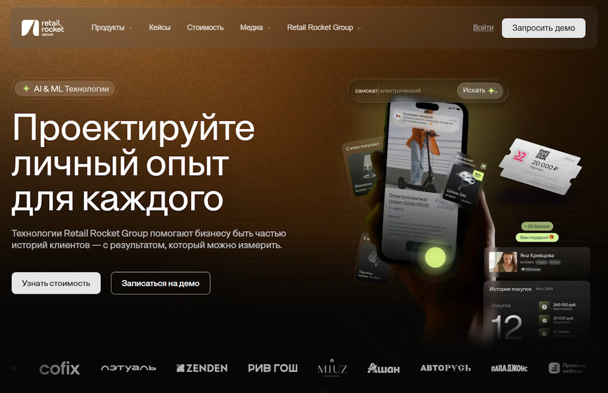 Retail Rocket специализируется на персонализированных товарных рекомендациях на основе машинного обучения. Алгоритмы анализируют поведение каждого посетителя в реальном времени и формируют блоки «С этим покупают», «Вам может понравиться», «Недавно просмотренные» — это один из самых эффективных сервисов продвижения интернет-магазина для повышения LTV.