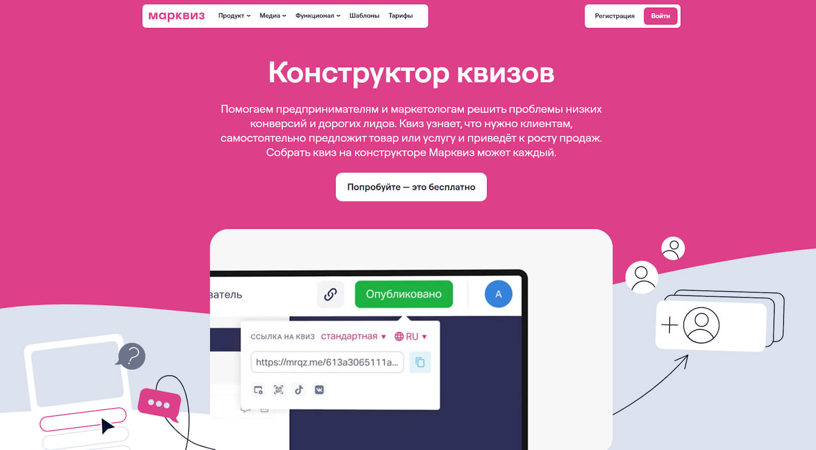 Marquiz специализируется на интерактивных квизах — формате «ответь на 5-7 вопросов и получи персональную рекомендацию». По данным разработчиков, квизы увеличивают конверсию сайта в 2-3 раза по сравнению со стандартными формами обратной связи.