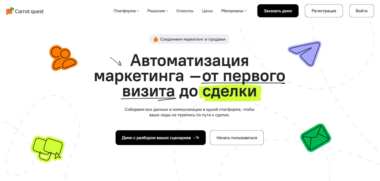Carrot Quest стирает границу между чат-ботом, email-сервисом и CRM: платформа отслеживает каждое действие посетителя и запускает персонализированные сценарии автоматически. Для каждого пользователя создаётся карточка с полным путём от первого визита до покупки.