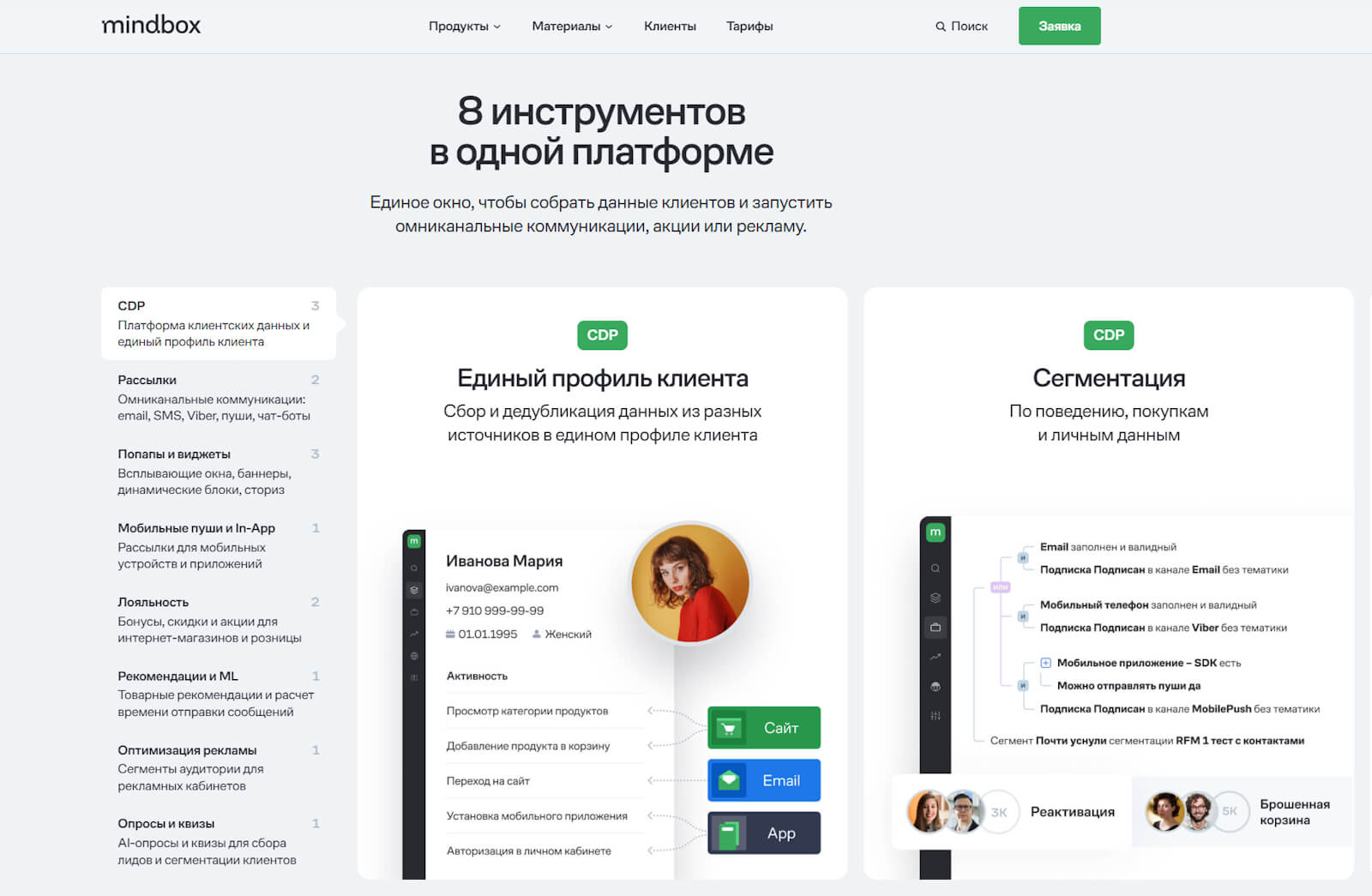 Mindbox — крупнейшая российская CDP-платформа: 1 000+ клиентов, выручка свыше 2,8 млрд ₽, девять продуктов в единой экосистеме. Платформа объединяет данные из всех точек контакта — сайт, кассы, приложение, колл-центр, рекламные кабинеты — в единый профиль клиента.