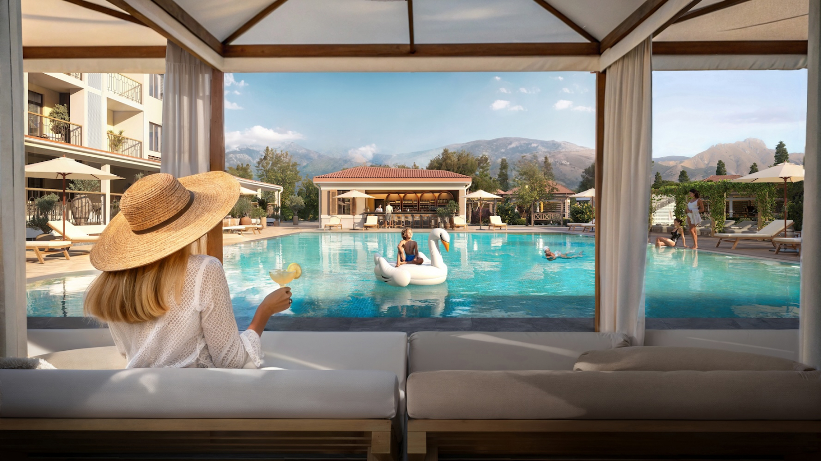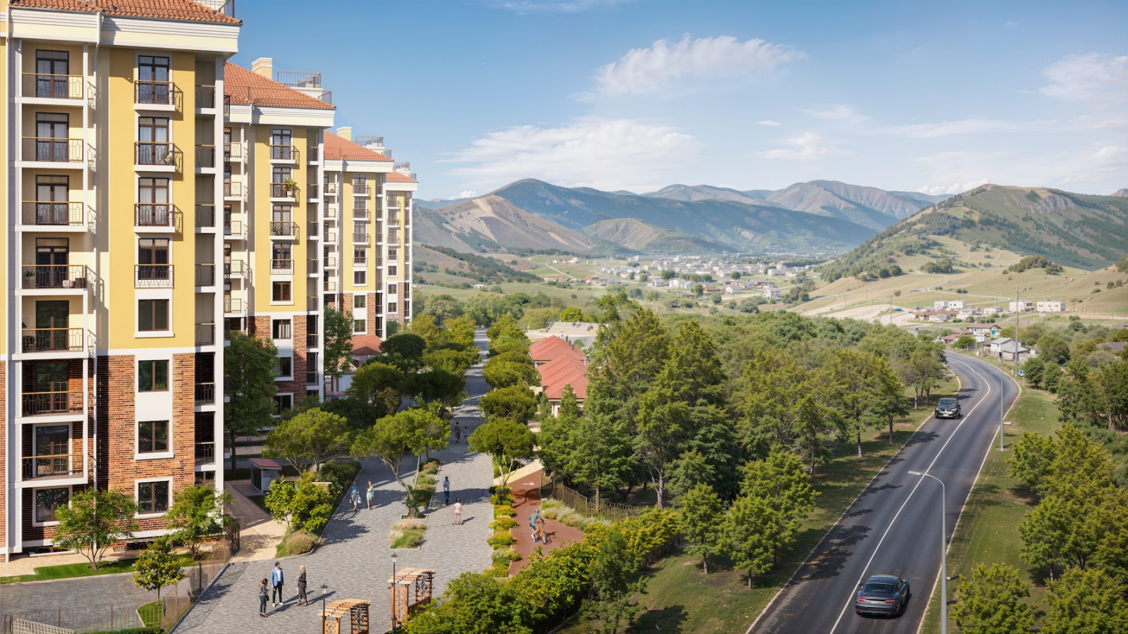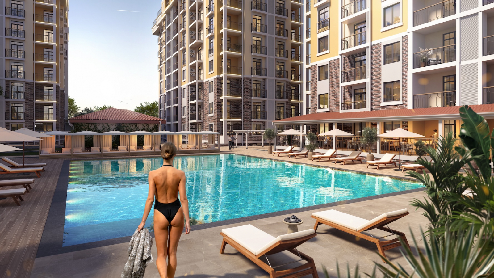 На территории всё, что нужно: бассейн под открытым небом, зона отдыха, современная спортплощадка и отдельная детская территория. Виды открываются — море, горы, немного внутреннего двора и для самых внимательных — кладбище, но с этим художественным фоном обещают быстро разобраться: между ближайшей вечностью и комплексом всё равно что-то построят из серии «государственное». Безопасность обеспечена.