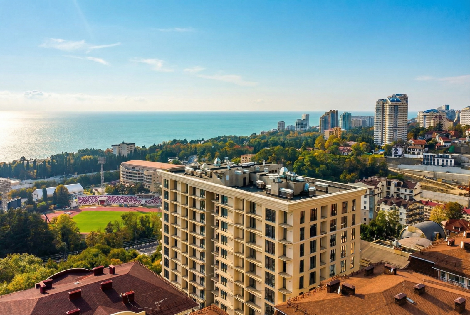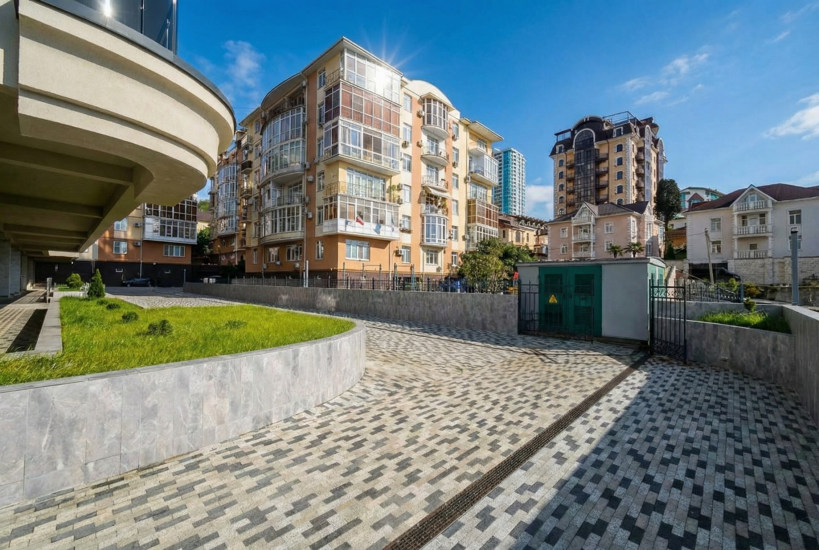 Комплекс — сильный, локацию выбрали удачно: южный склон Бытхи, к морю ближе, чем соседние большие проекты, сдан официально — без классического для Сочи “через суд”. Да, в процессе суды были, до Верховного доходило, но по итогу — дом введён, документы в порядке, никаких подвешенных историй.