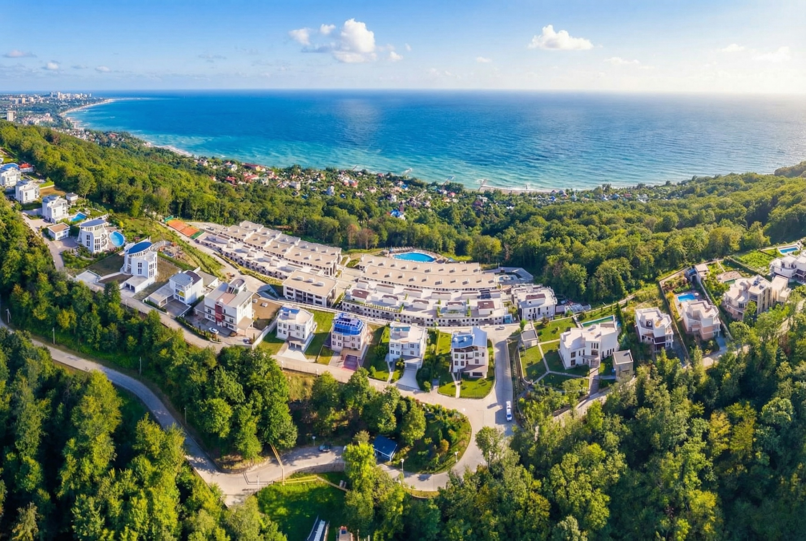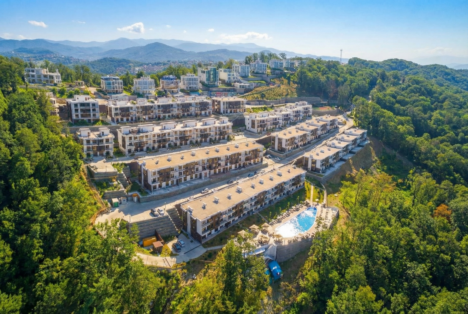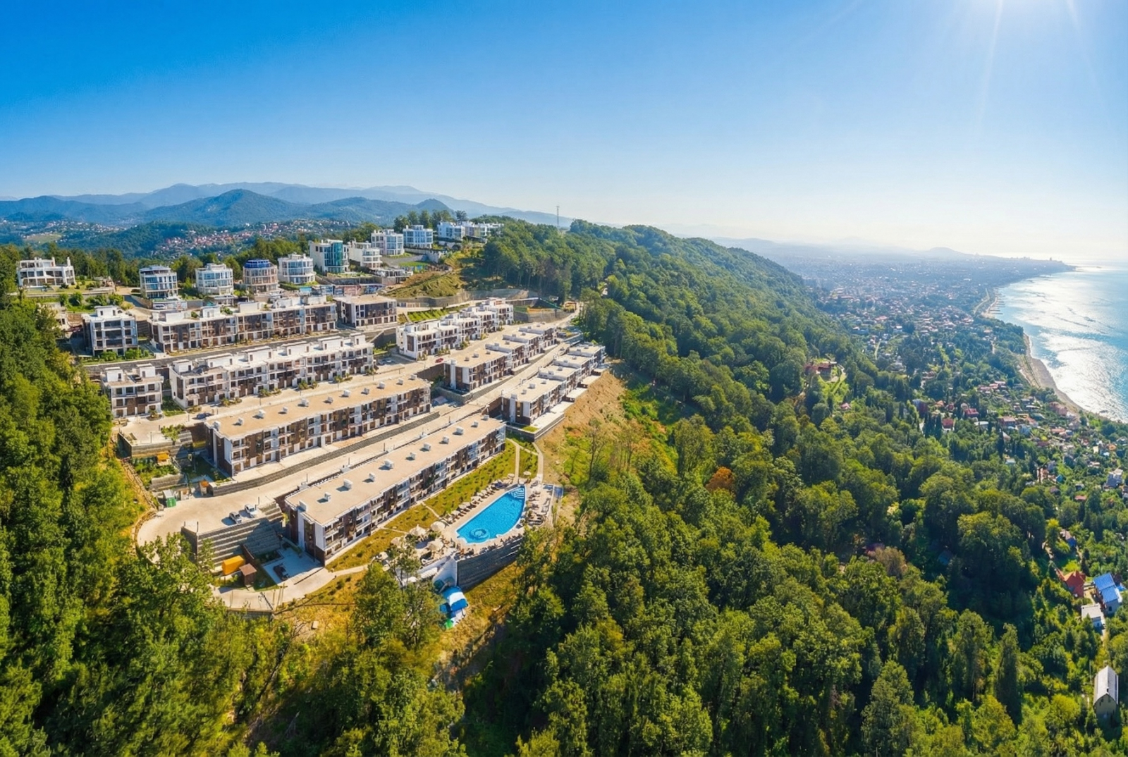 Комплекс построен на вершине Мамайского перевала — виды из большинства квартир действительно впечатляют. Море, холмы — если в Сочи мечтали о панораме, тут она реально в каждом окне. Всё, как в хорошем буклете, но дома — не фотошоп, а настоящее.