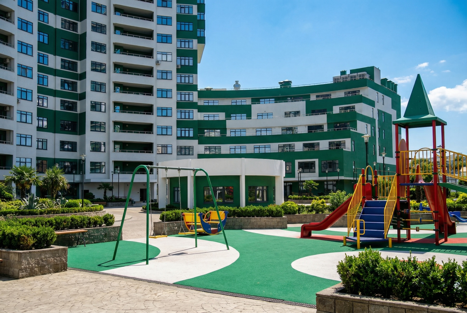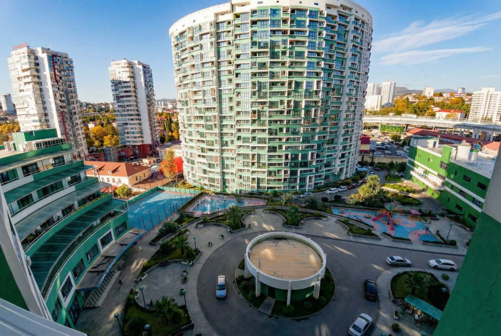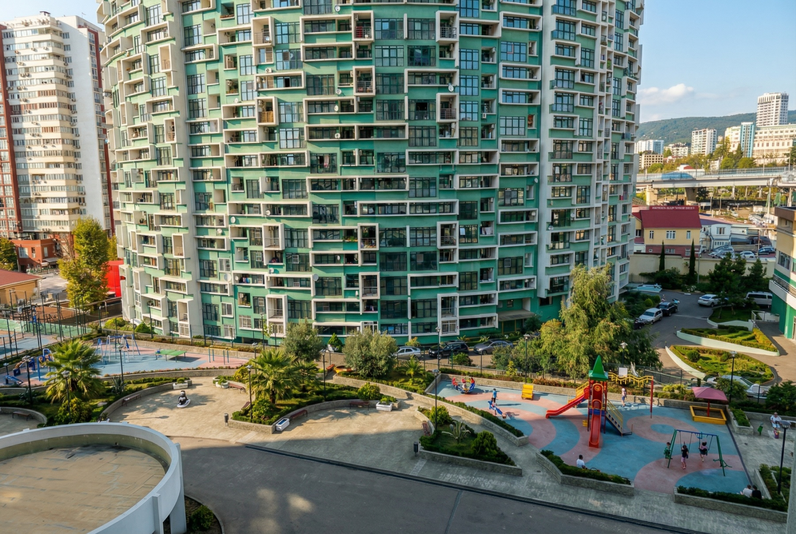Во дворе всё, что нужно: спортплощадки, детские зоны — взрослые делают вид, что занимаются спортом, дети делают вид, что не ругаются на качелях. Вид — или на море, или на горы. В Сочи иначе стыдно, если что.