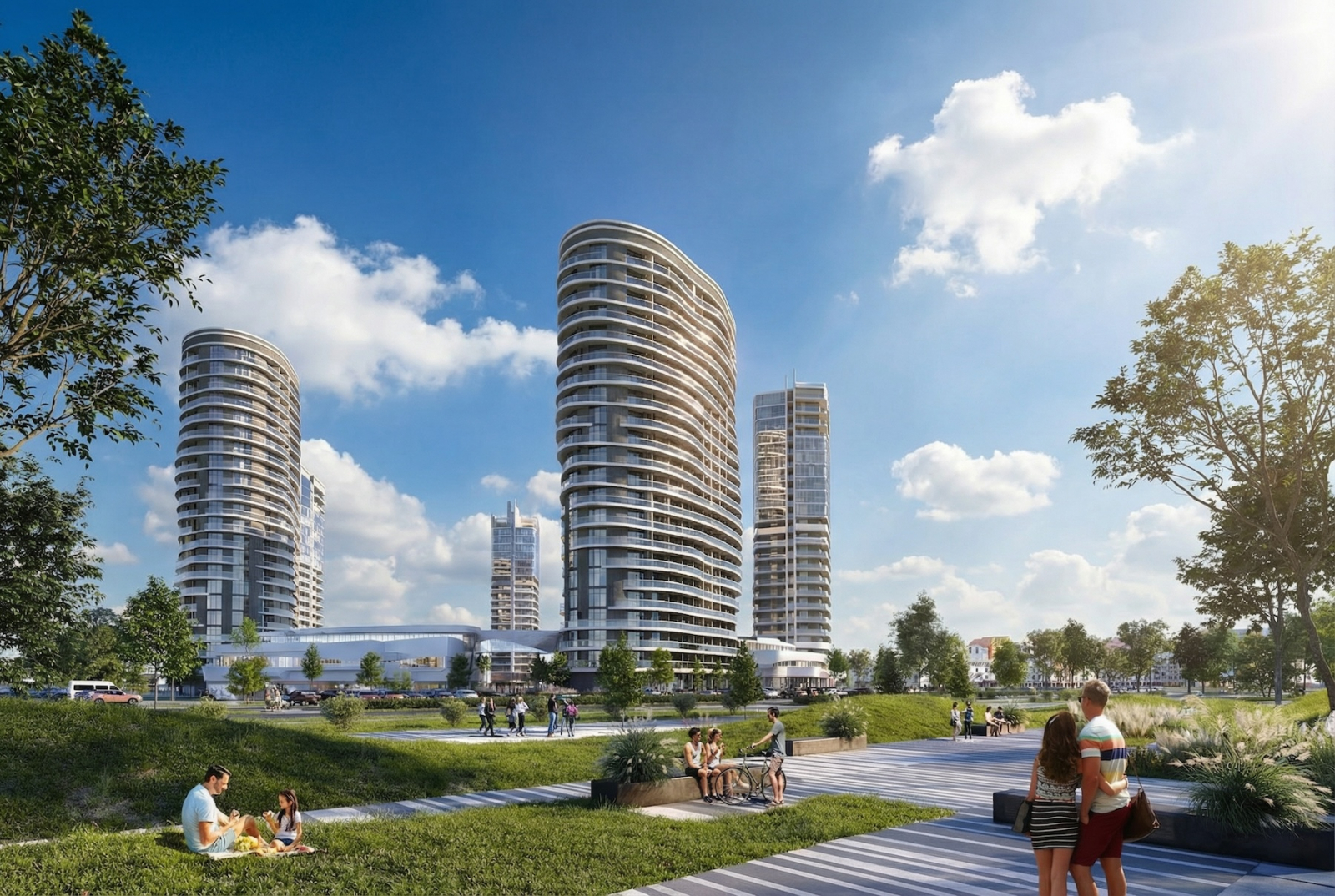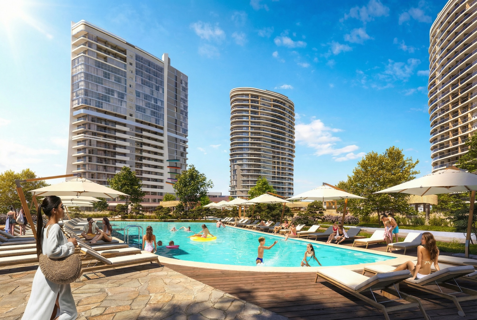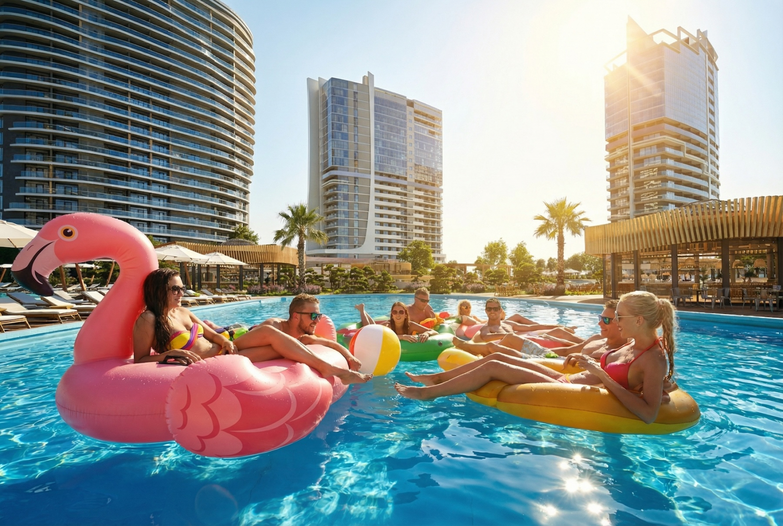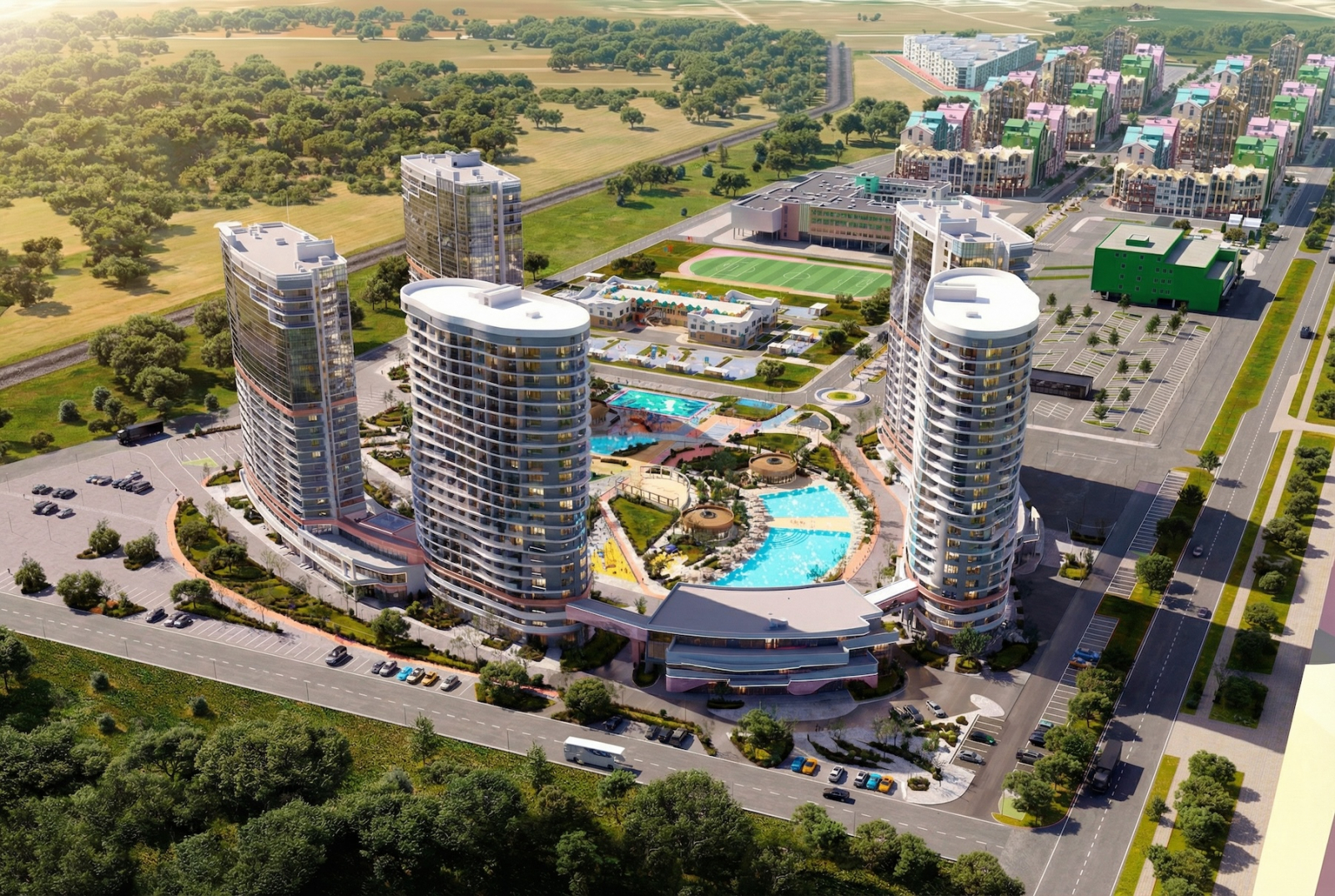 Теперь сам комплекс. Пять башен по 22 этажа — с такими высотами без хорошего вида в принципе не уйдешь. Сверху — панорамы, снизу — внутренняя жизнь в формате «отдых для своих»: бассейны, релакс-зоны, спорт и детские площадки. Рестораны, кафе, фитнес и спа — тоже на территории. Завтракать «не дома»? Легко. Место под машину искать не надо — парковка огромная, даже припарковаться получится «по настроению».