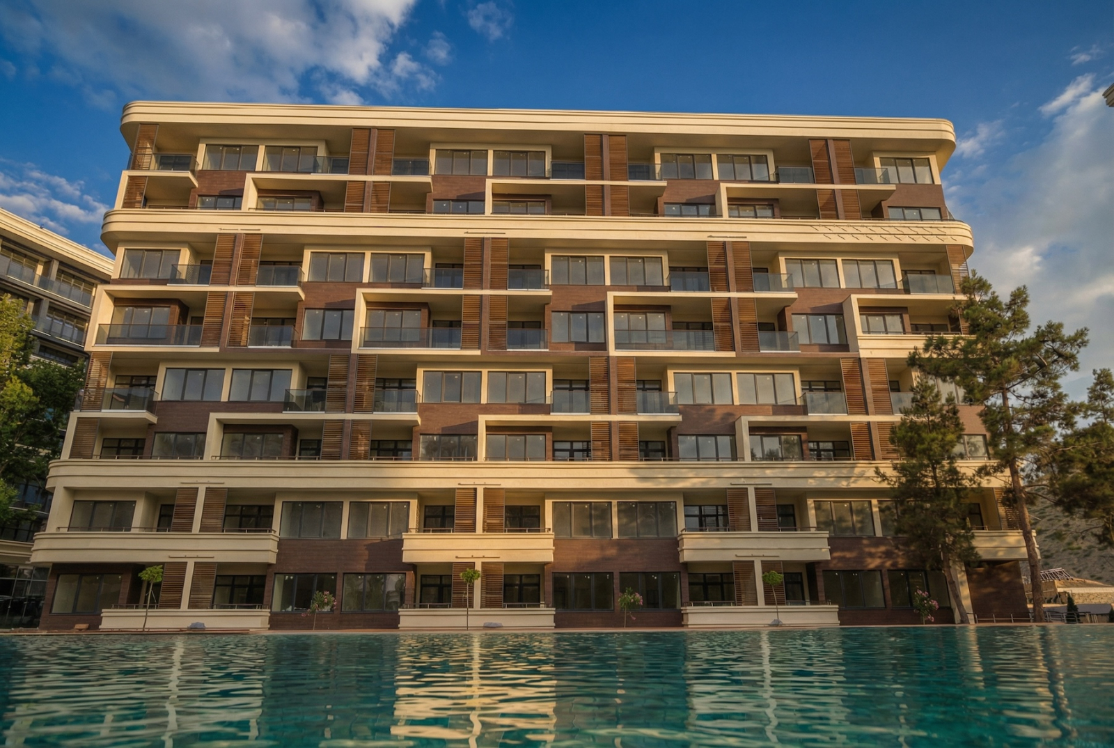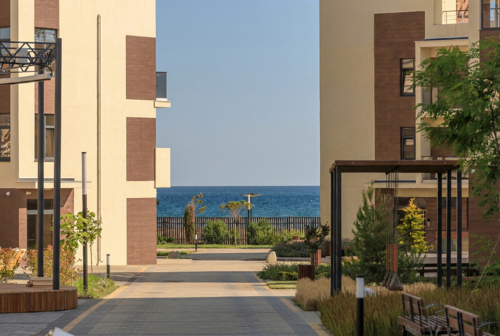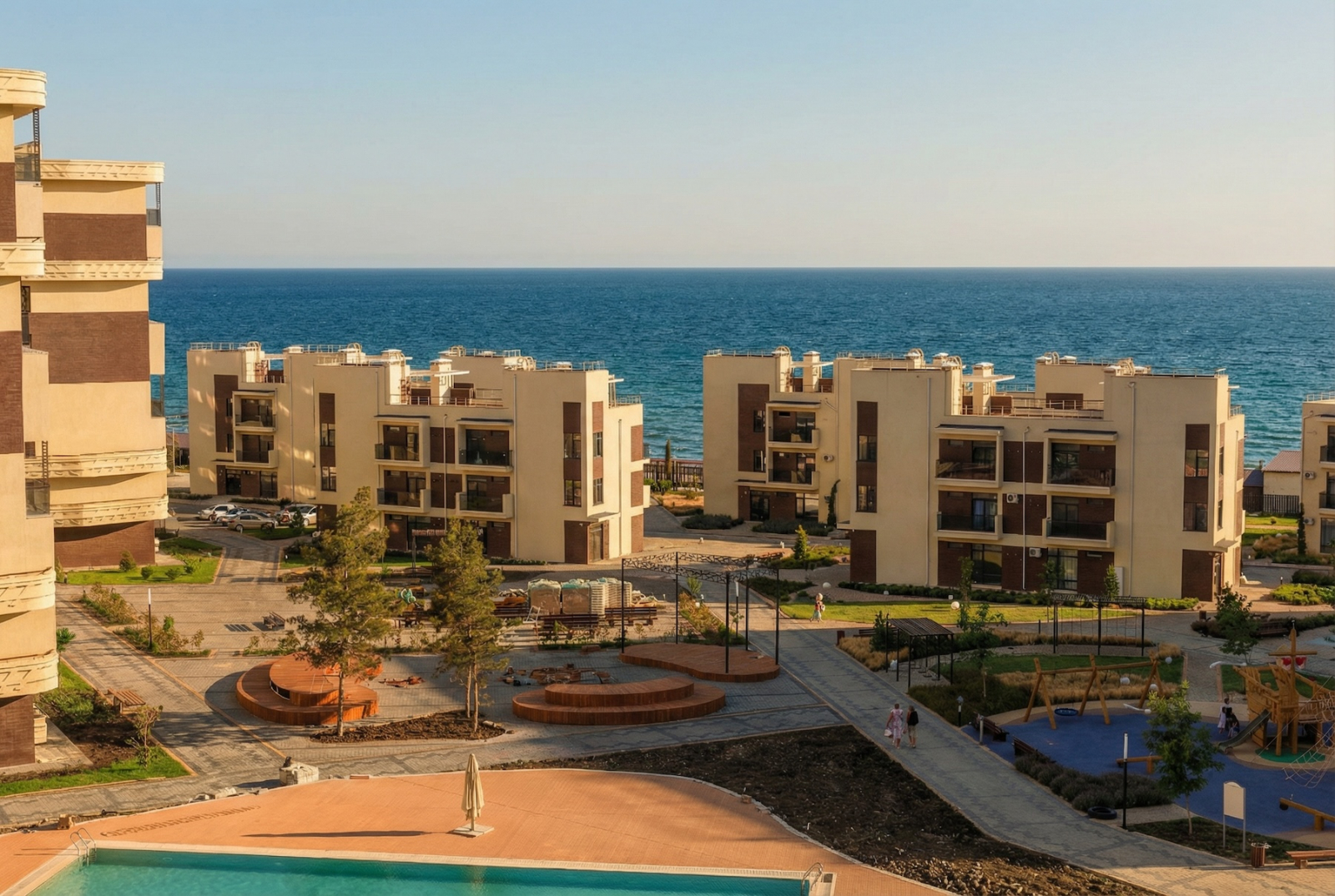Территория закрытая, пляж ухоженный, и никто случайный не сбежит к вам с полотенцем, спрашивая, «а ты тут живёшь?». Открытые бассейны для тех, кто считает море слишком солёным, а вид на Алчак — такой, что Instagram сам просит вас выложить фото.