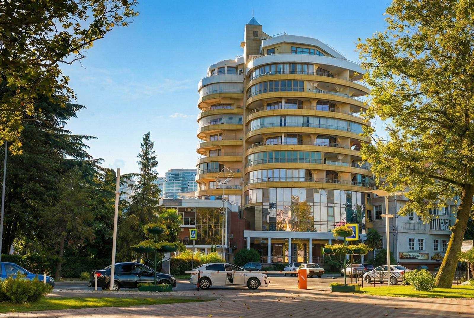 Да, дом не новый, не вершина 3D-рендера, но тут вопрос не в степени новизны, а в том, что за окном. А там – почти максимальный набор сочинской жизни: напротив ресторан «Хмели-Синели» LRG (в Сочи с таким соседом можно забыть о кухонной плите), пять минут — и уже в «Гранд Марине» с огоньками и ощущением, что вокруг идут съёмки рекламы новой жизни. (Не факт, что вашей, но почему бы и нет.)