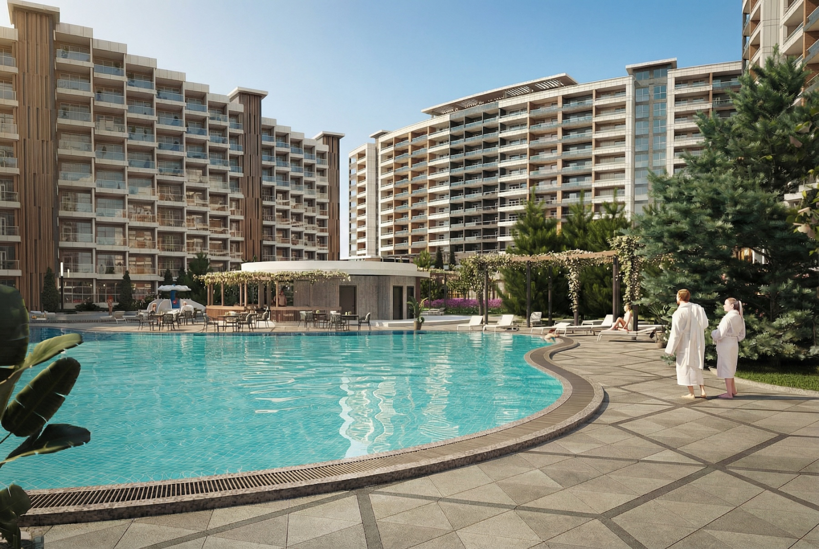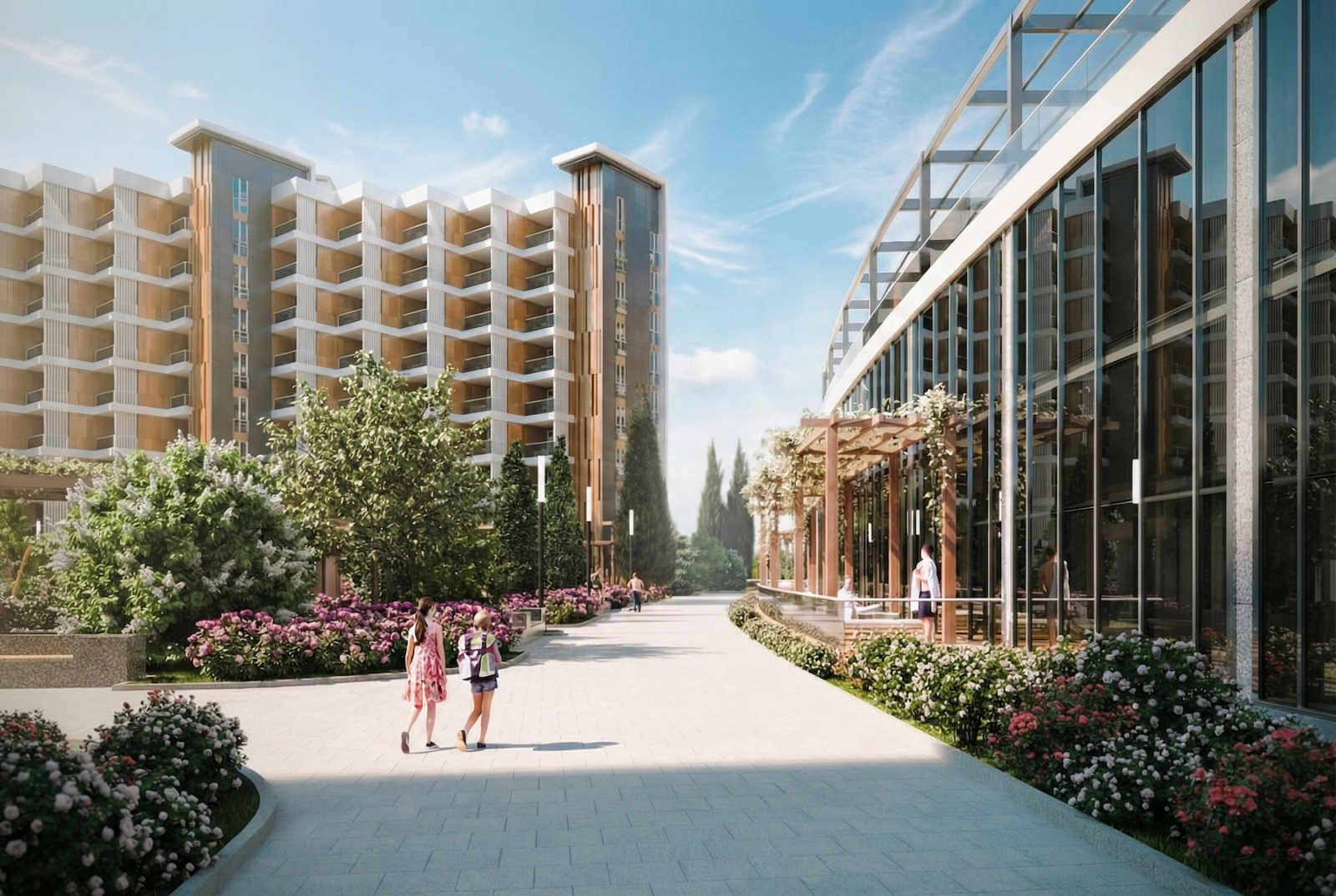 Территория закрытая, бассейн, спорт и детские площадки, кафе, ресторан — всё как положено для семейного курорта с претензией на долгую жизнь. Корпуса 9-12 этажей, уместный для Крыма масштаб, вид на море идёт не как опция, а как часть предложения. Площади — на любой сценарий: от практичных 30 до масштабных 144 м² — обычная семья без труда влезет с запасом для сувениров и привычек.