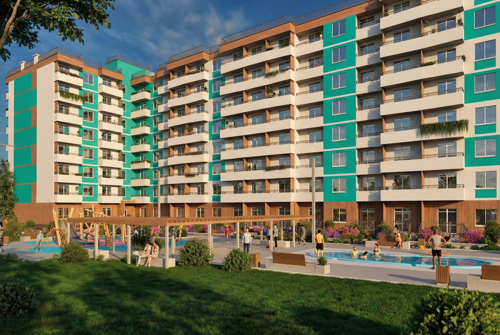 Корпуса — восьмиэтажные. Такой компромисс для современных: не башня под облаками, но и не “малоэтажка, где слышно, когда сосед заводит чайник”. На территории всё, что нужно для жизни без компромиссов: бассейн, зона отдыха, площадки для детей и тех, кто считает себя спортсменом — выбор между “поплавать” и “поиграть во что-нибудь”. Класс “комфорт”, если без маркетинга.