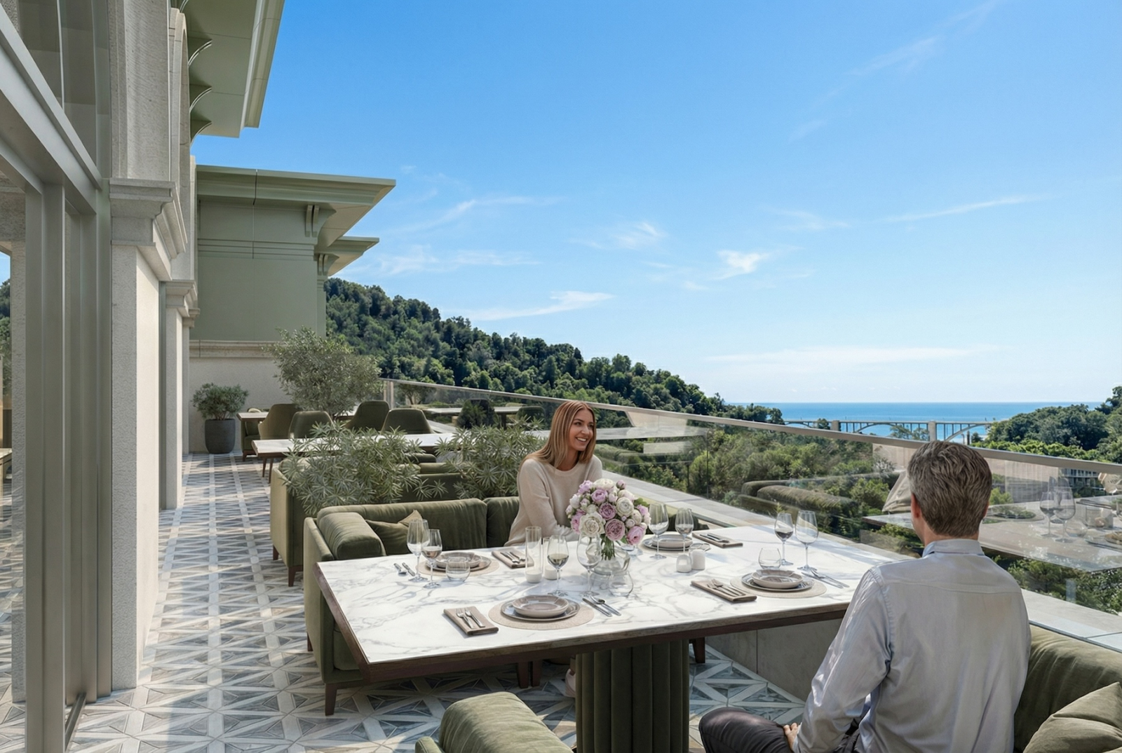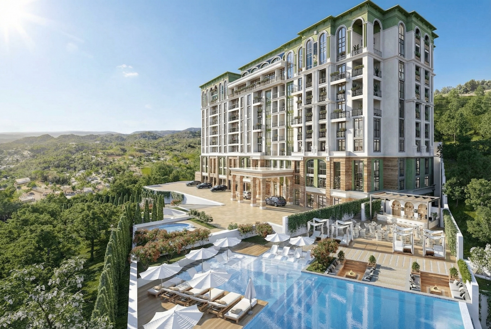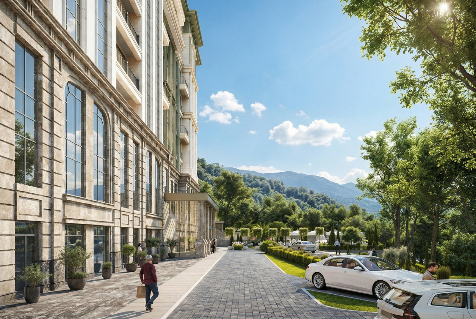 Внутри – удобные планировки, апартаменты с панорамным остеклением, фасад в современном классическом стиле. Без “советских мотивов” и без попыток построить очередной стеклянный муравейник на курорте.