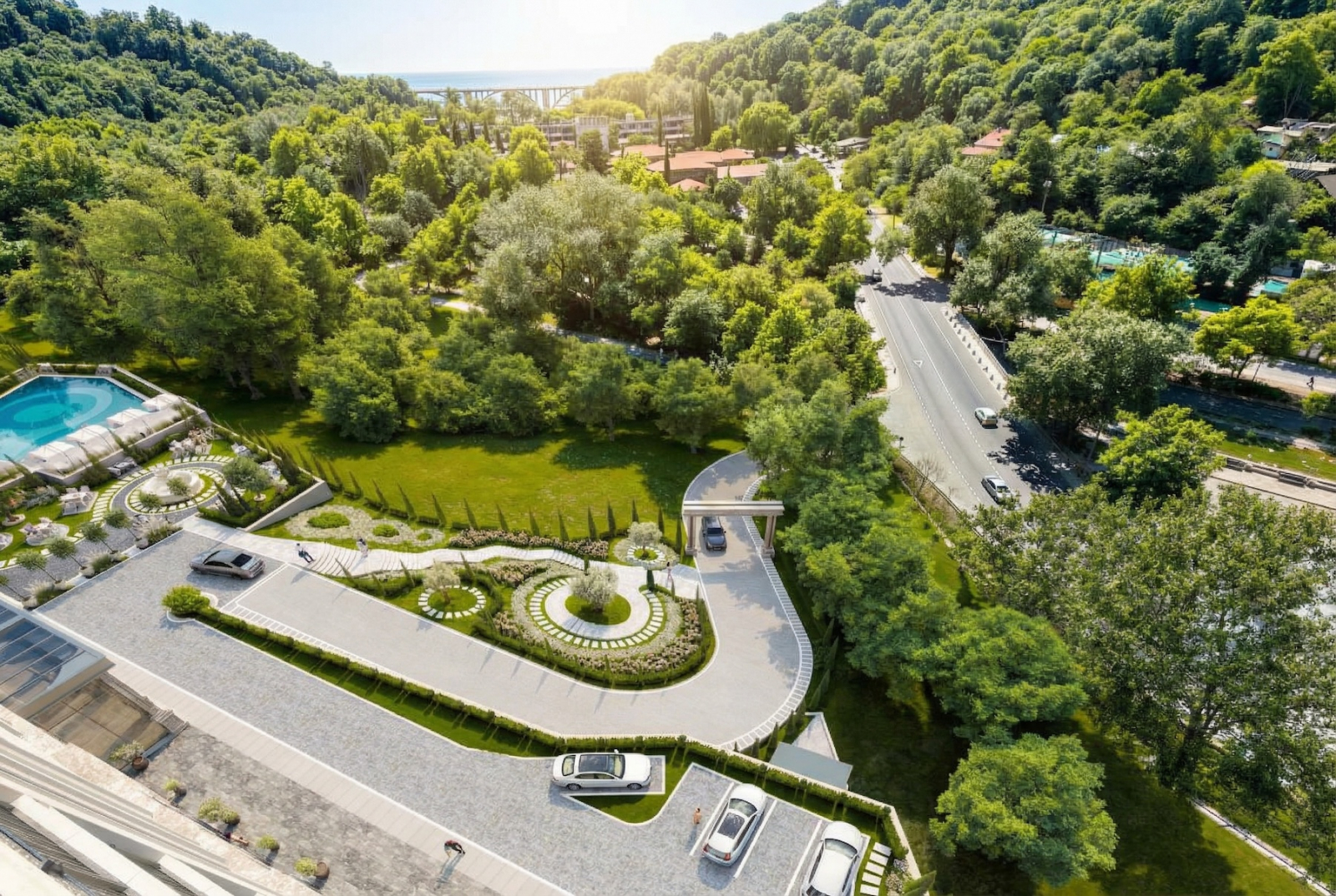 Локация честная: комплекс строят в микрорайоне Мацеста, минут десять пешком до пляжа, ещё быстрее – до набережной одноимённой реки.