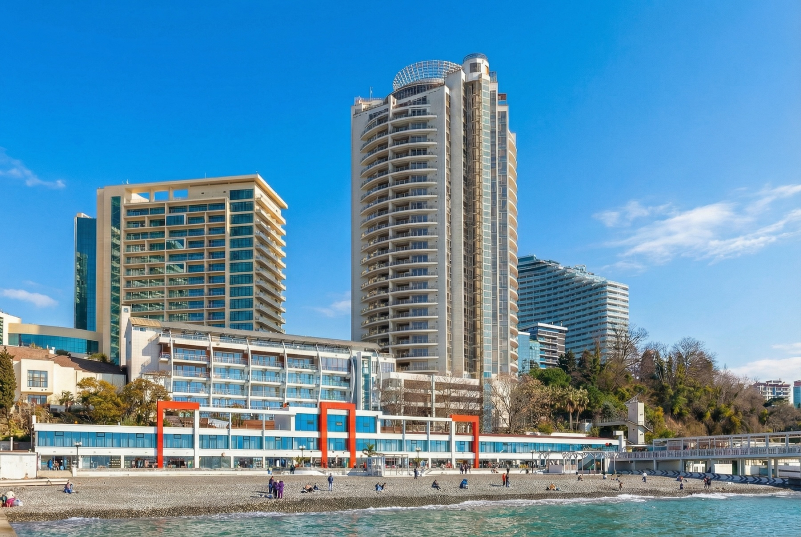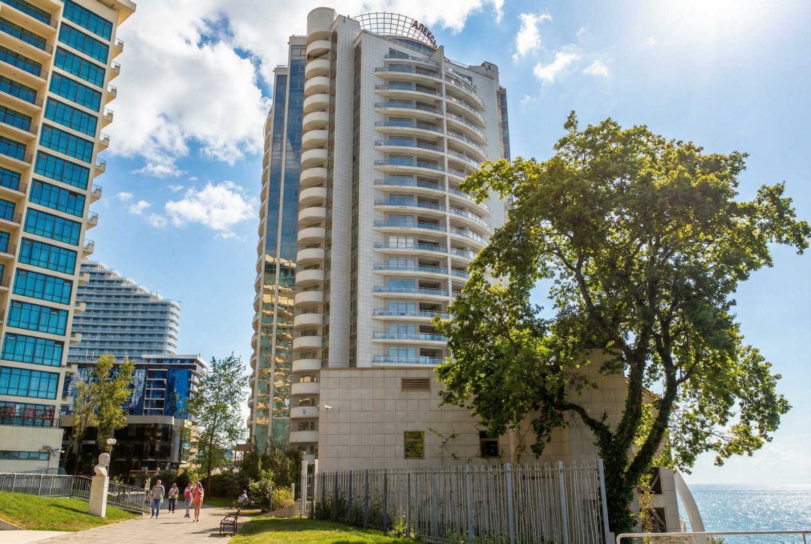 Вот это действительно редкий случай: дому больше 15 лет, а выглядит он так, будто новый сезон вышел буквально вчера, а не повтор какого-то старого сериала, который уже видел весь город. “Александрийский маяк” стоит в самом сердце Сочи — реально 50 метров до центральной набережной и моря. Не фантазии маркетолога, когда “рядом” означает пару километров и обязательный квест по пробкам, а именно “вот вышел — вот уже море и набережная”. Двухуровневая прогулочная зона, вид на море как с открытки — именно тот, под который запускают салют после последнего бокала 31 декабря.