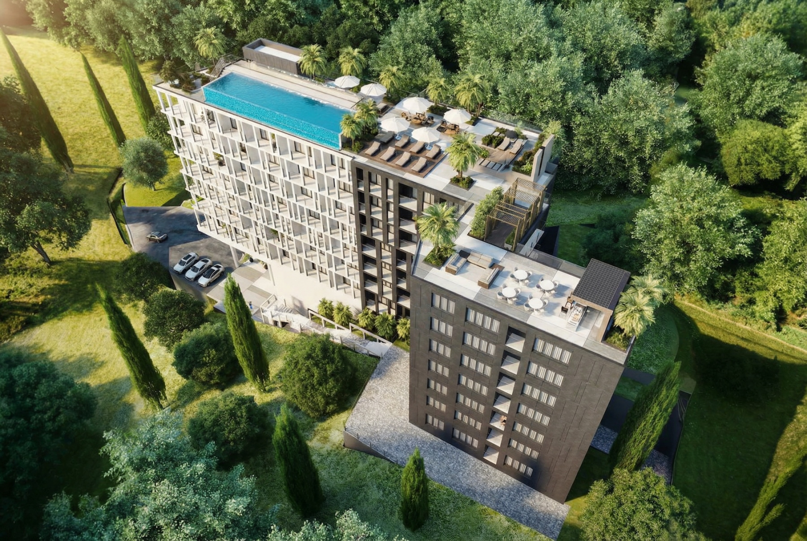 Cнаружи Cosmos Stay Adler — тот самый «инстаграммный» продукт, где инфинити-бассейн на крыше не просто “украшение”, а повод завести отдельный хайлайт “Закаты и отражения”. Глядите на море, ловите солнце, наполняйте ленту. Ах да, закат — в комплекте.