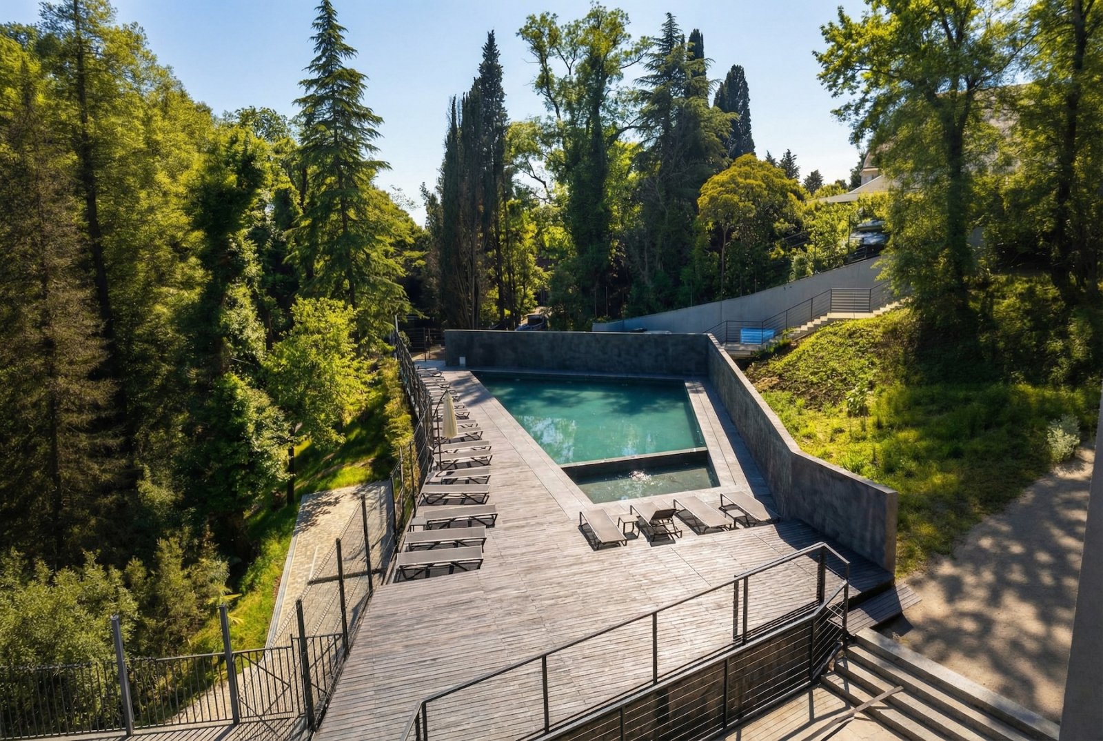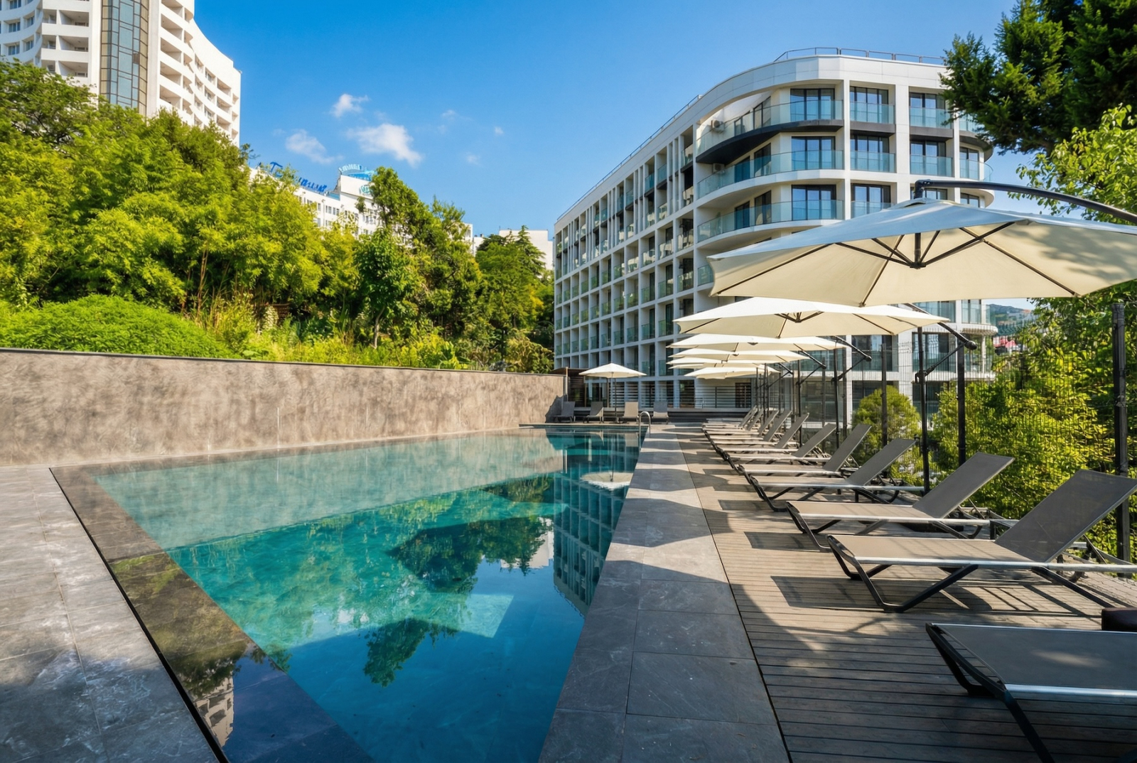 Территория компактная, зато закрытая. Есть бассейн, зона отдыха, все как мы любим: кто-то загорает, кто-то делает селфи, кто-то честно изображает плавание. Есть подземный паркинг — настоящая роскошь для тех, кто хотя бы раз пытался припарковаться в сезон в Сочи и понял, как дорого бывают «свои» места.