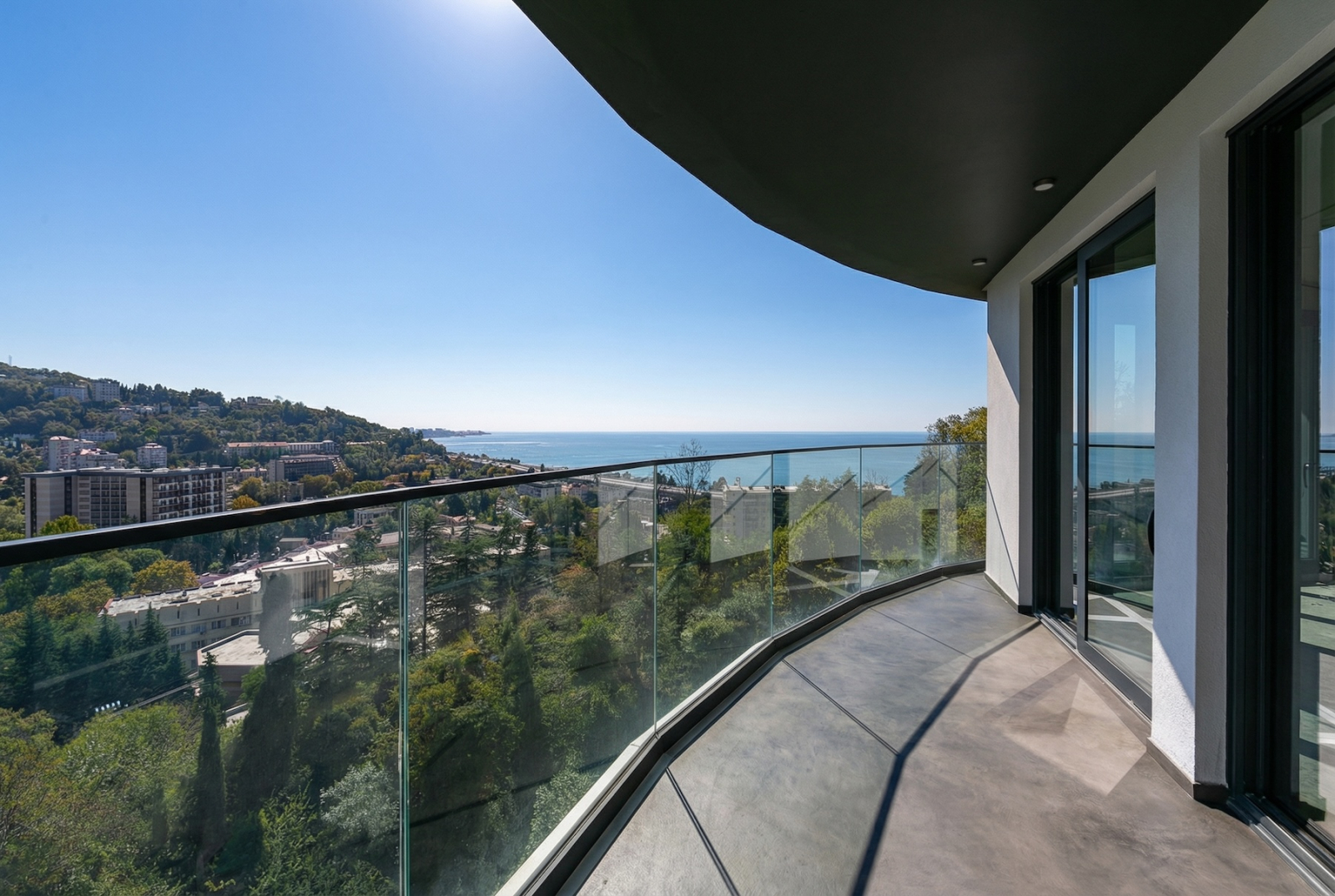 Балконы с закалённым стеклом: ничего не упадёт, никто не выпадет, селфи — без лишних прутьев и смущающих внешностей. Из части апартов виды — море или горы: классическая сочинская дилемма, которую решают на уровне «где больше скидка».