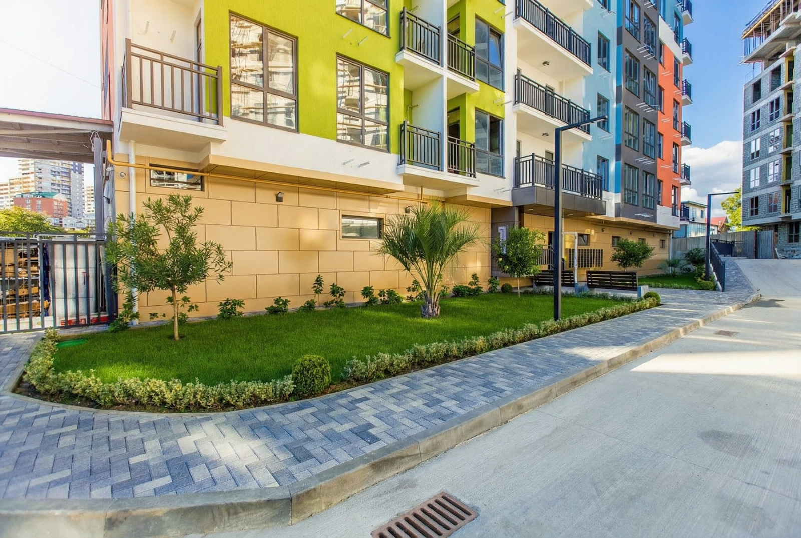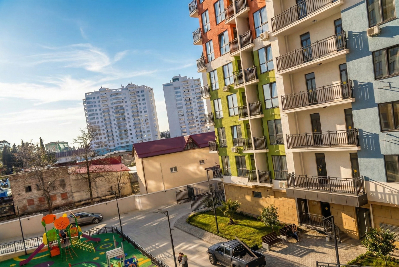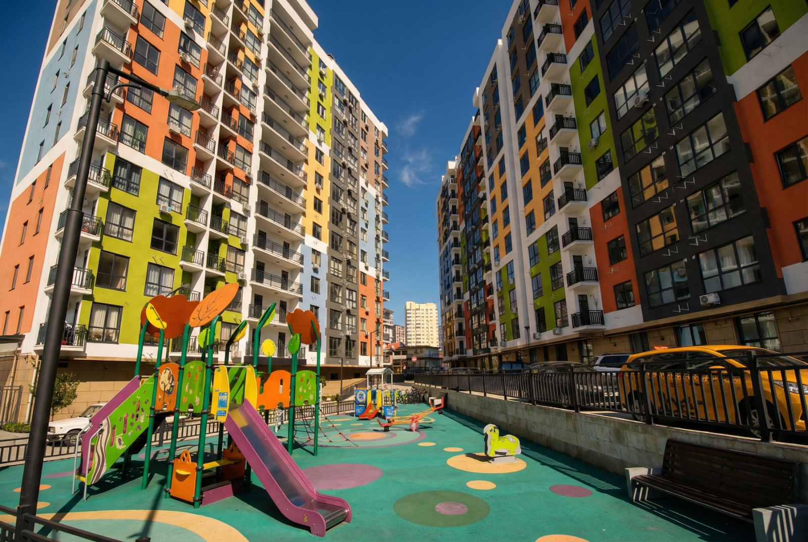 Территория комплекса: — придомовая парковка (не из серии «на 300 машин», но есть и радует), — детские площадки (где дети реально бегают и иногда падают), — спортивные (где взрослые вспоминают, что когда-то знали, что такое спорт).