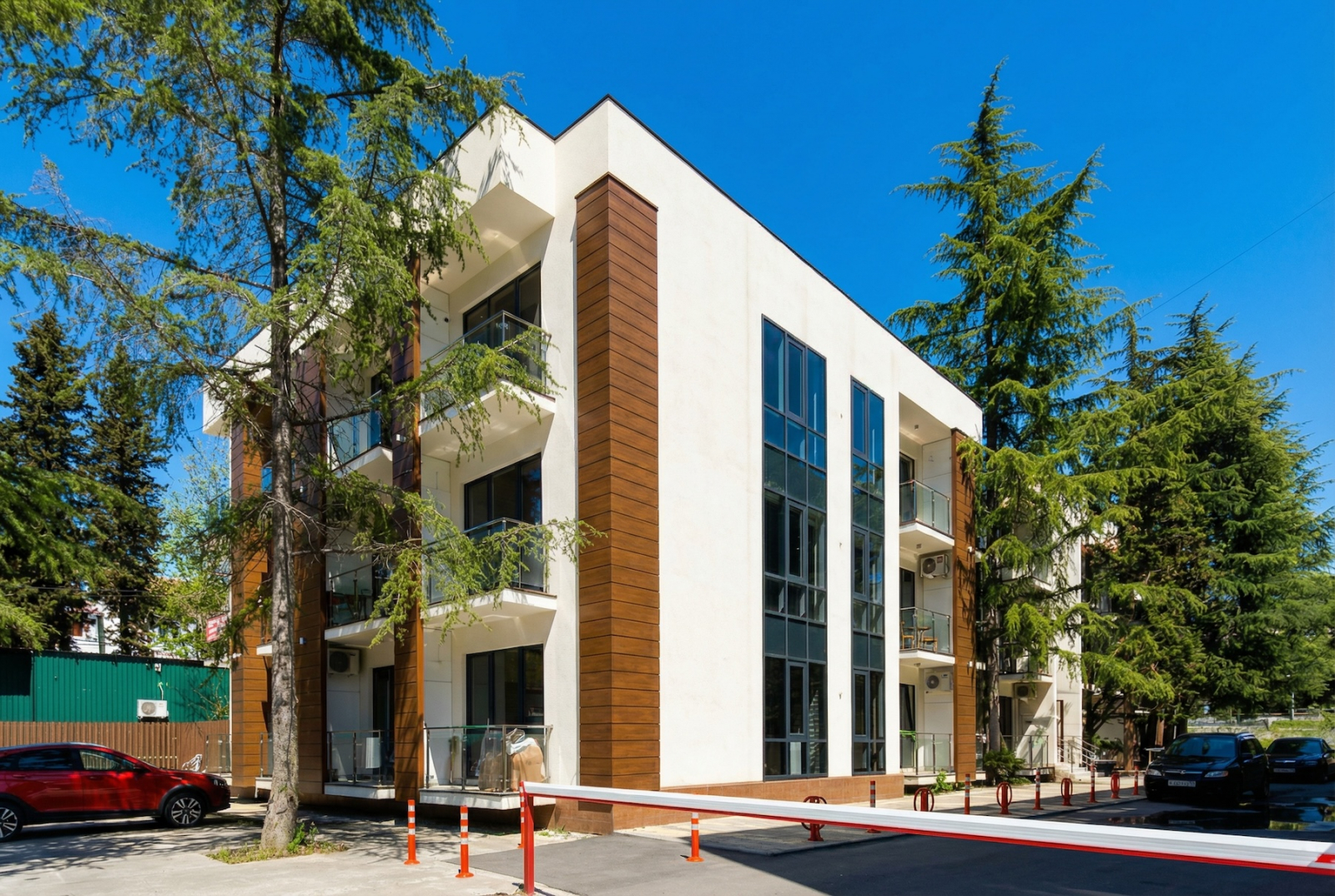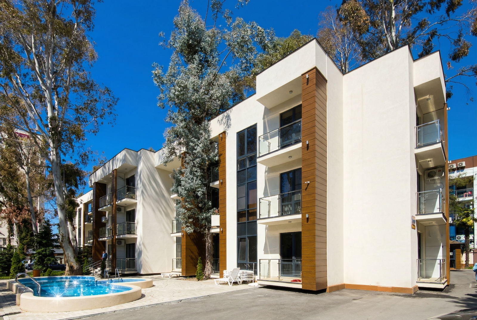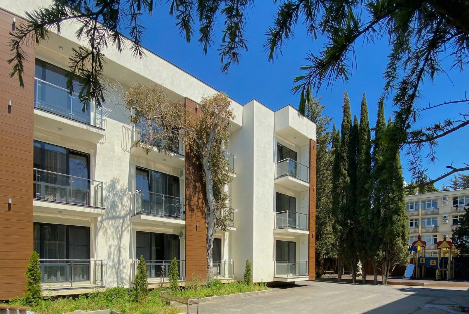 Отдельный плюс — комплекс органично вписали в существующую застройку. Сохранились кипарисы, эвкалипты, зелень. Не всё сровняли, не построили голый бетон, а оставили кусочек южного пейзажа. Строила солидная компания — не энтузиазм, не скотч с надеждой, а реальная качественная работа.