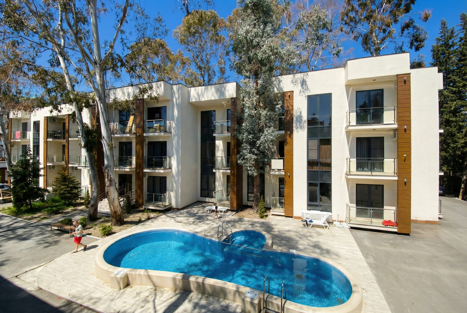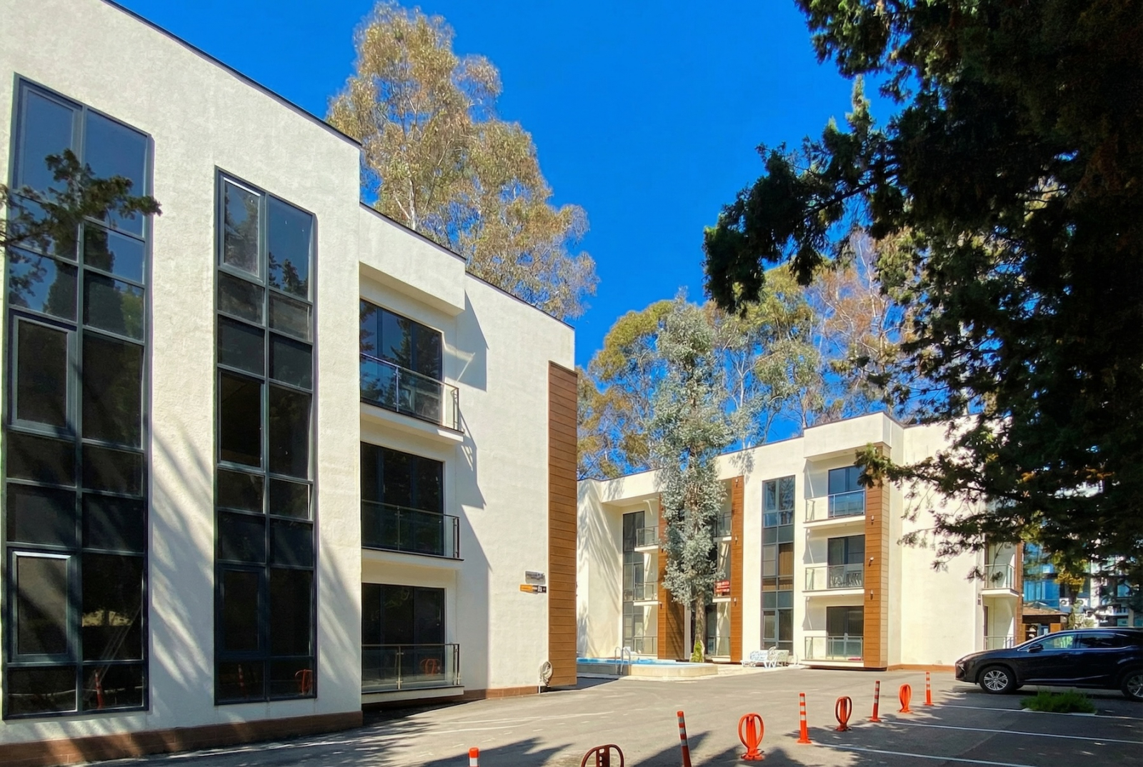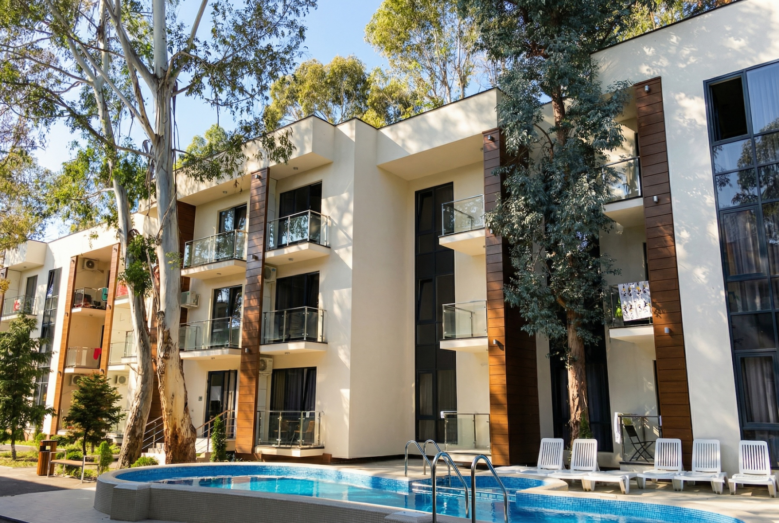 Отдельный плюс — комплекс органично вписали в существующую застройку. Сохранились кипарисы, эвкалипты, зелень. Не всё сровняли, не построили голый бетон, а оставили кусочек южного пейзажа. Строила солидная компания — не энтузиазм, не скотч с надеждой, а реальная качественная работа.