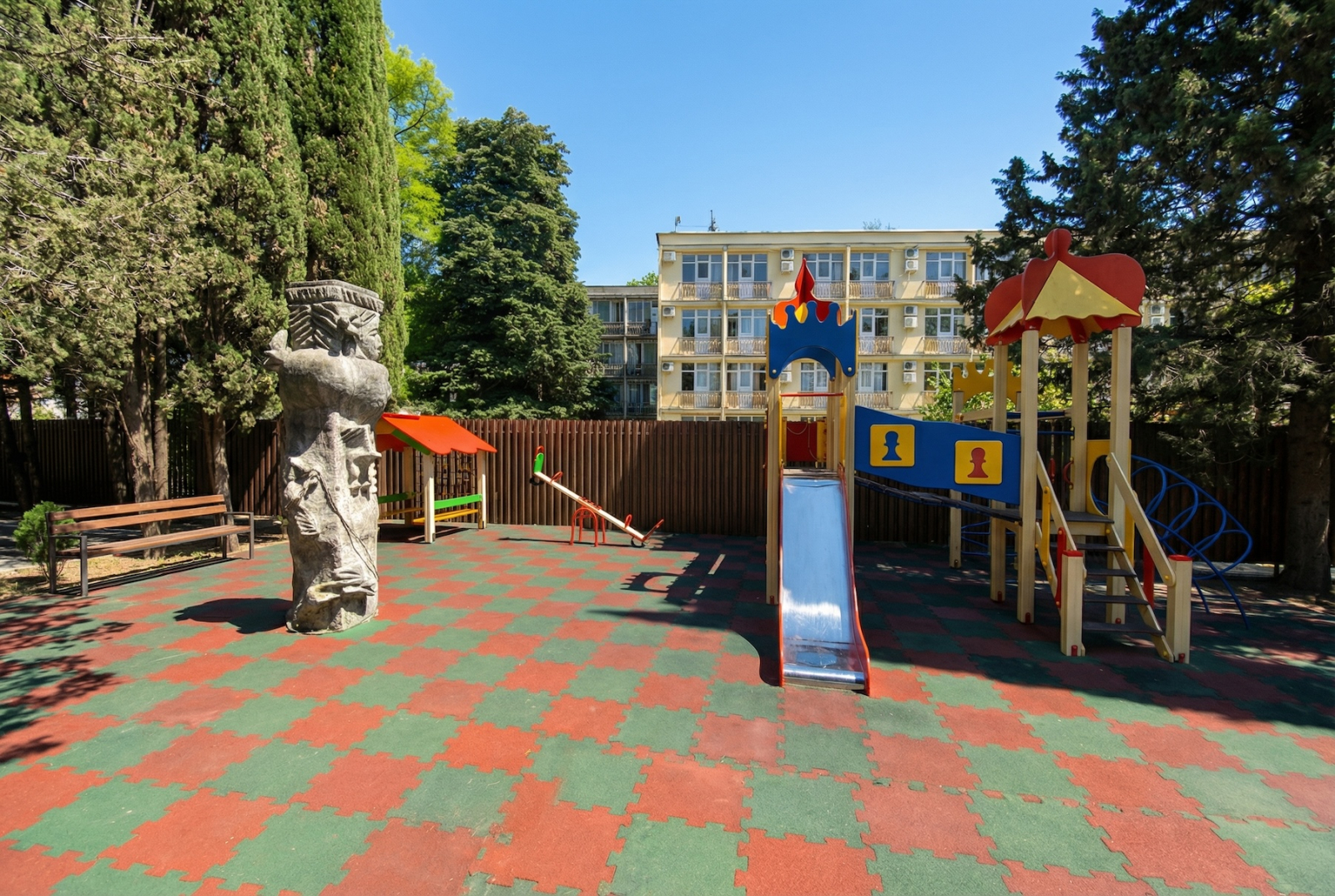 Во дворе всё, что нужно для отдыха и жизни на курорте: — небольшой бассейн, чтобы не отправляться за хлоркой на другой конец города; — спортивная и детская площадки — детям бегать, взрослым делать вид, что они в форме; — придомовая парковка — мини-игра «занять место до соседа».