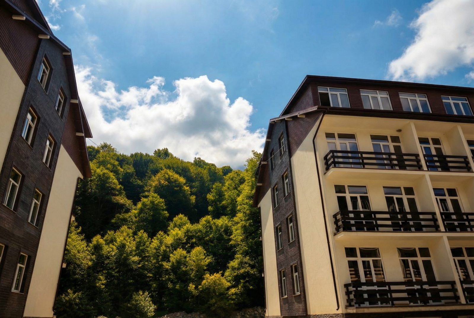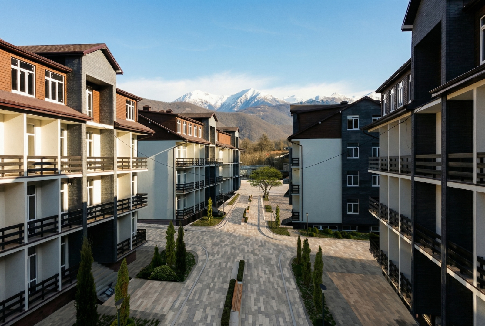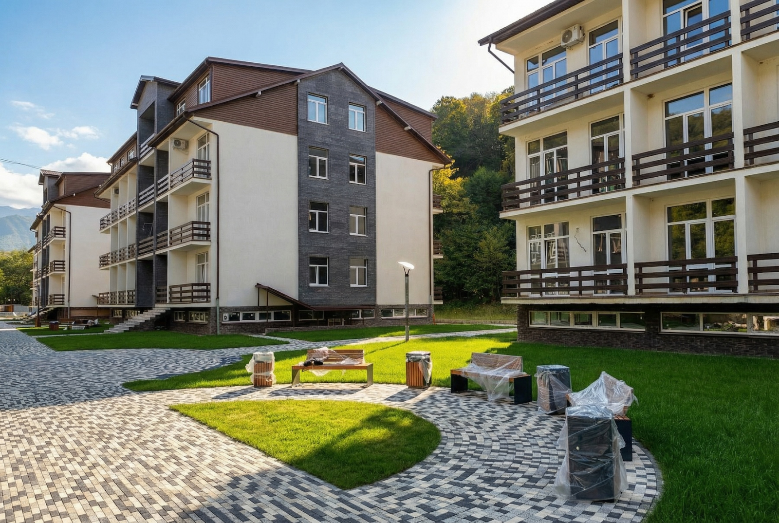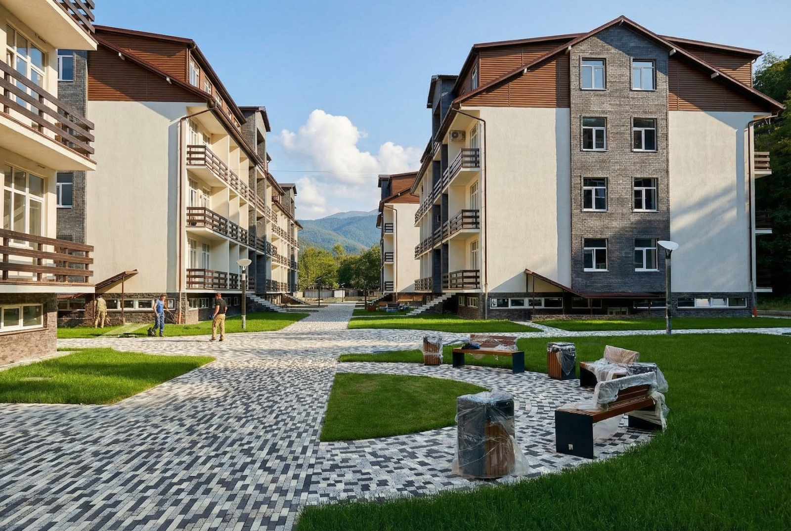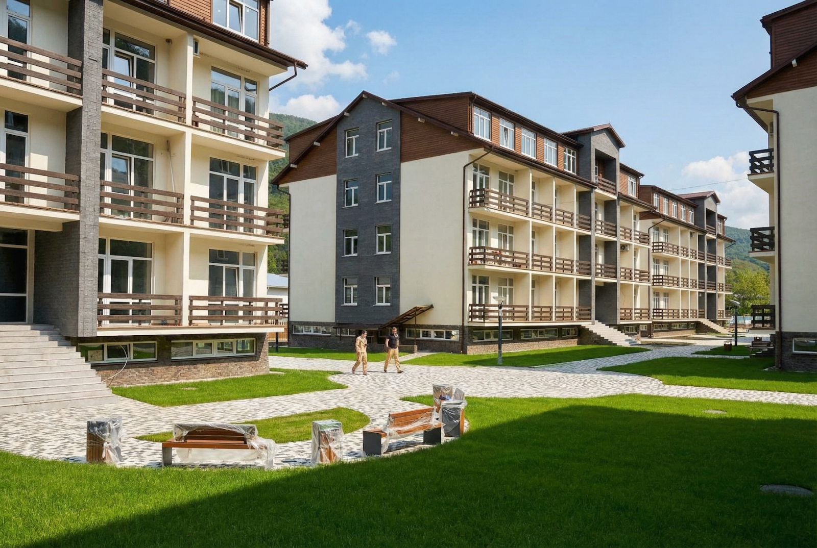 Комплекс состоит из десяти аккуратных четырёхэтажных корпусов с закрытой и уже облагороженной территорией. Ни тебе пятилетней стройки, ни марафона по колено в грязи — состояние «отелем могу назвать без сарказма». По инфраструктуре всё честно: — открытый бассейн, который работает круглый год (развития для любителей заплывов в декабре), — спортивная площадка (для тех, кто подниматься любит не только на подъёмнике), — детская площадка (детей можно выпустить, а взрослым сделать вид, что они в SPA).
