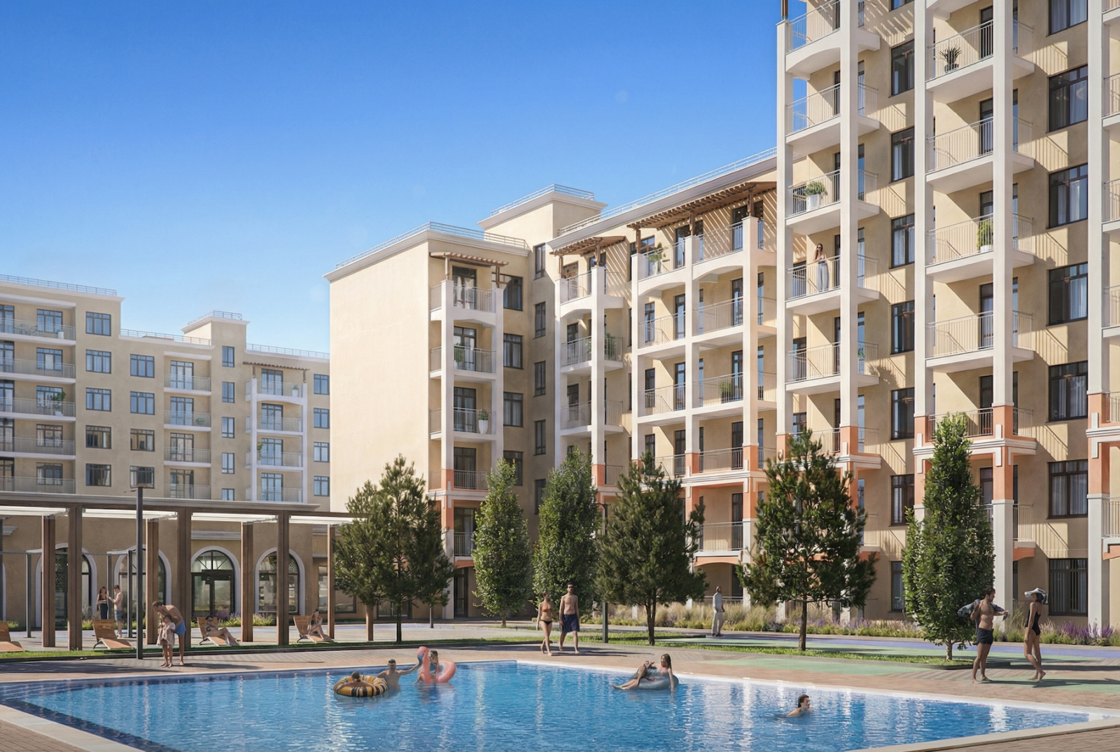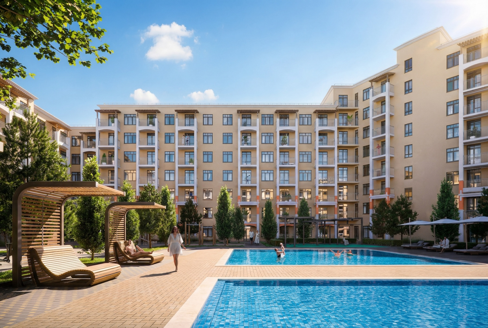 Инфраструктура проекта — привет из взрослой, продуманной жизни: парковки и у дома, и ниже уровня земли, бассейн у каждого корпуса (ну кто-то же должен купаться, если не в озере). В общем, комфорт не только для авто, но и для людей, которые уверены: отдых — это не только диван.