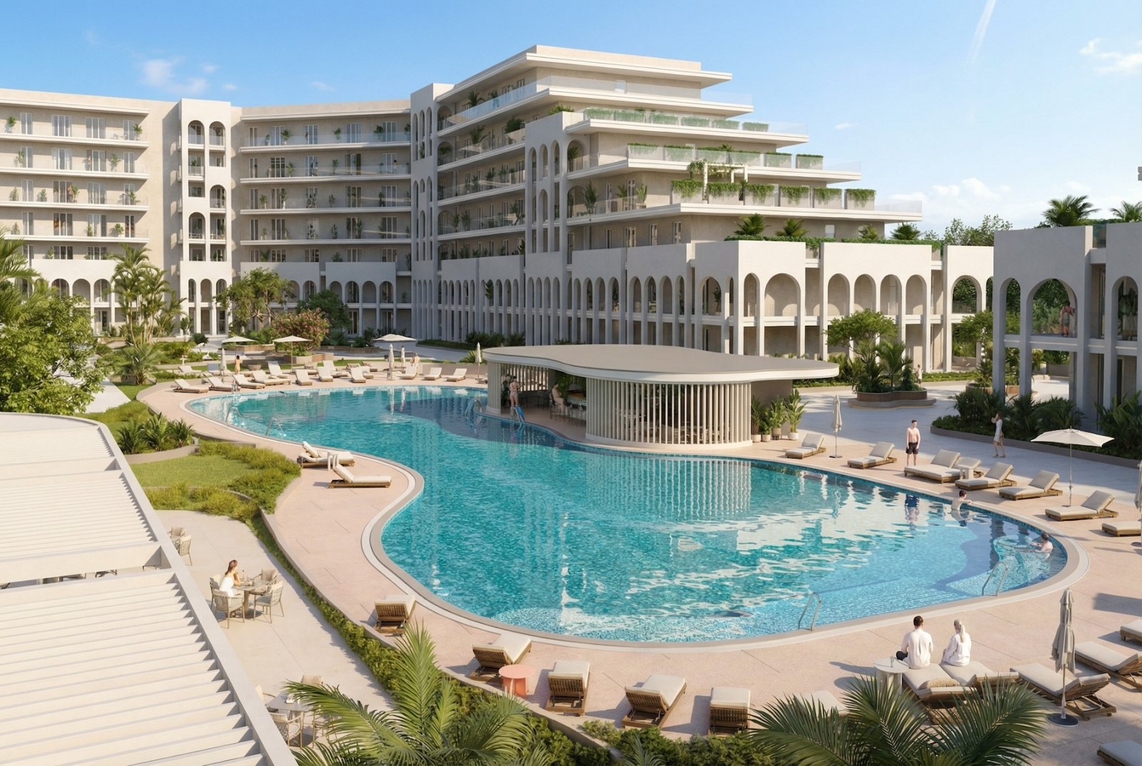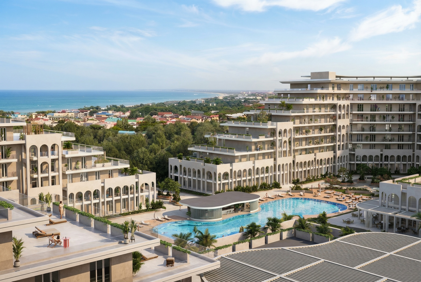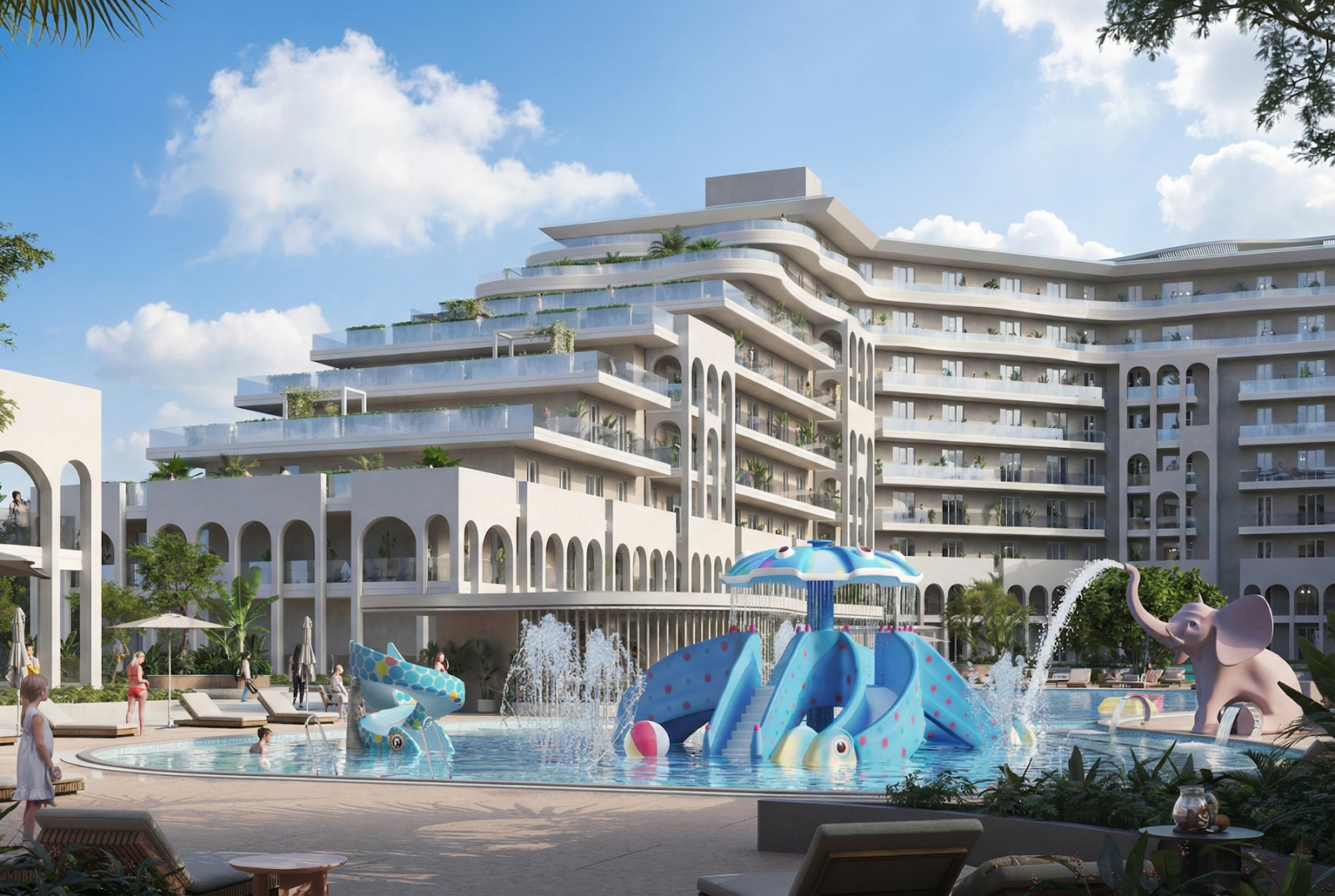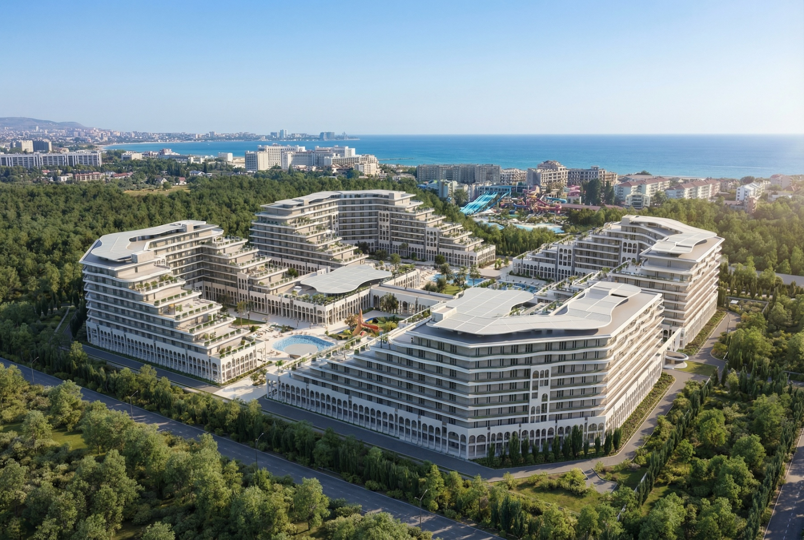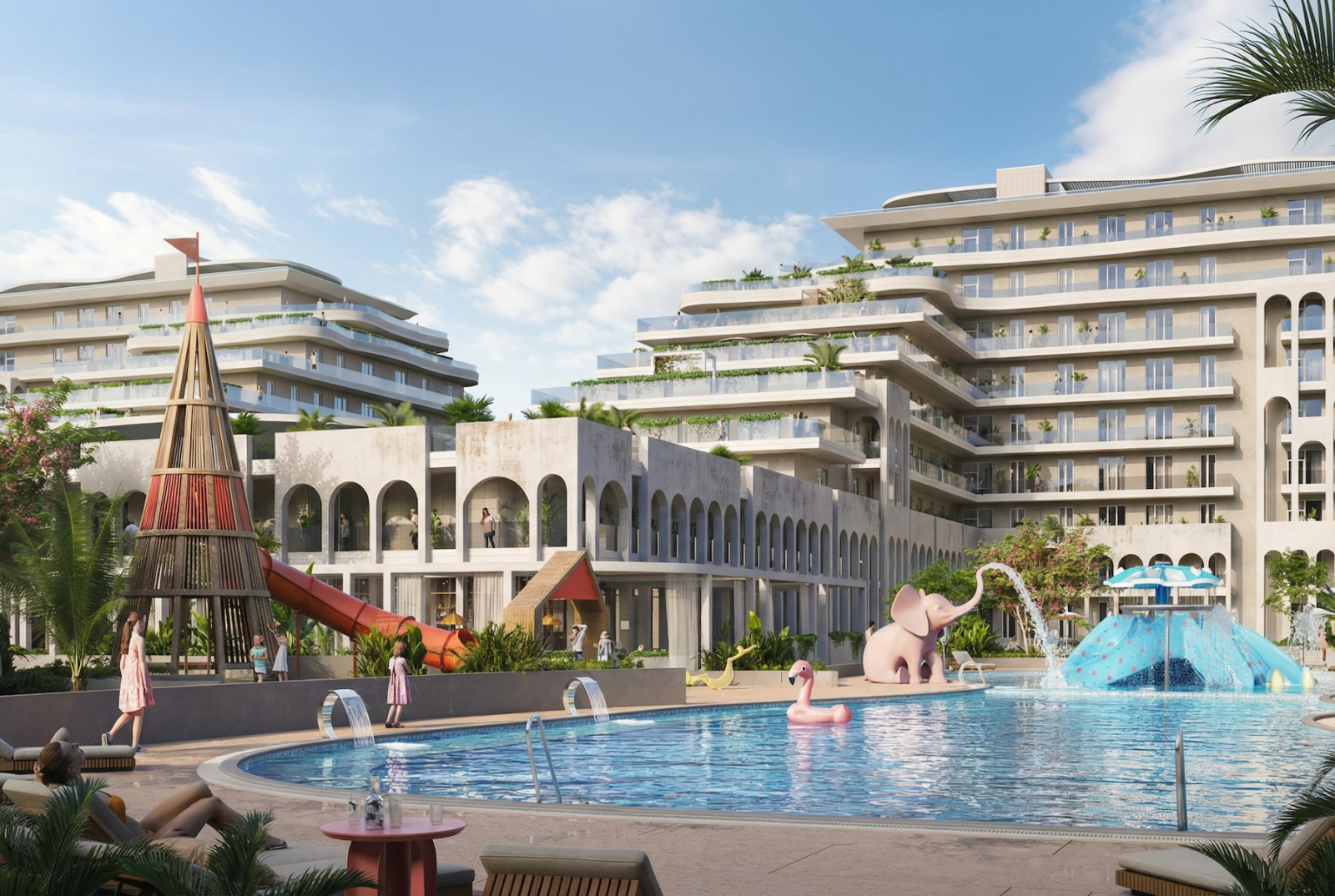 Рядом с вами — аквапарк Тики-Так. Не «у моря где-то», а буквально через забор. Если вас никто не узнал на входе, вы просто скажите честно, что из Сан Гардена — там всё свои. По близости во дворе — бассейн, детский бассейн, детская площадка, и всё остальное, что входит в базовую комплектацию хорошей жизни на юге.