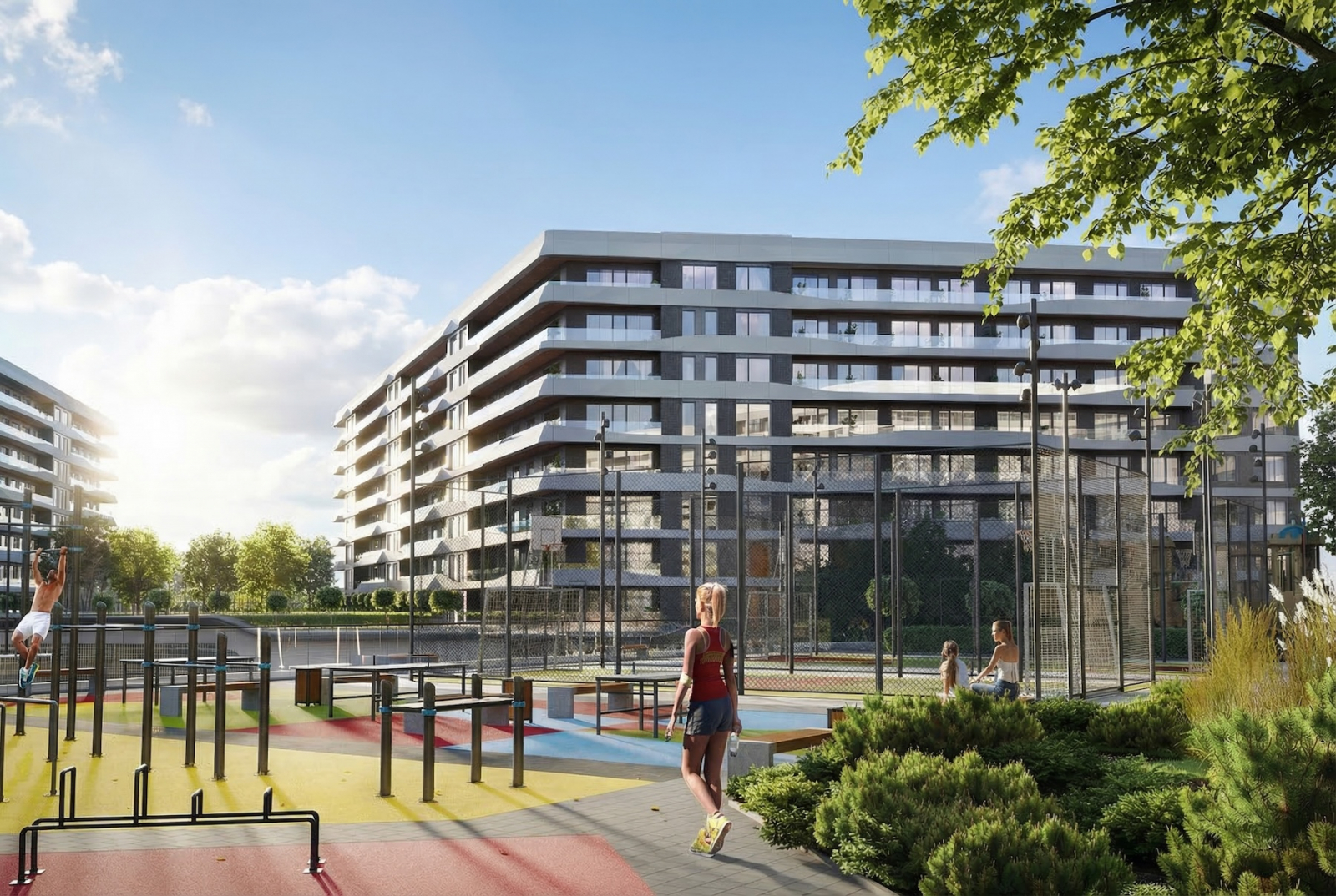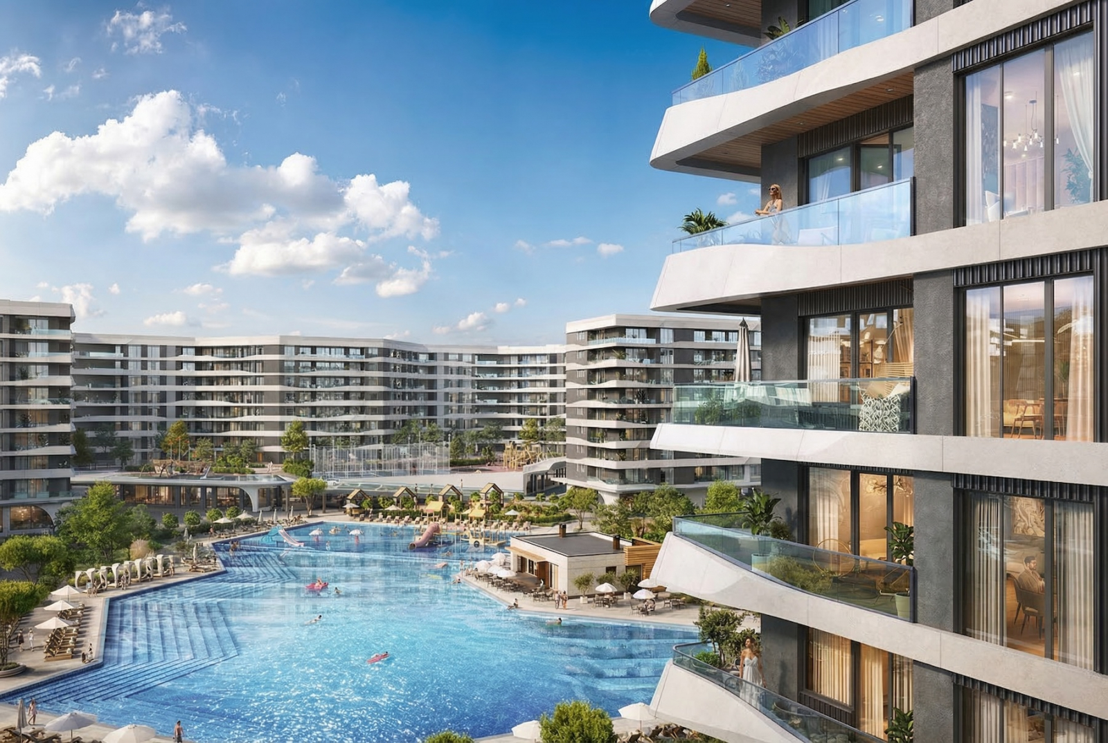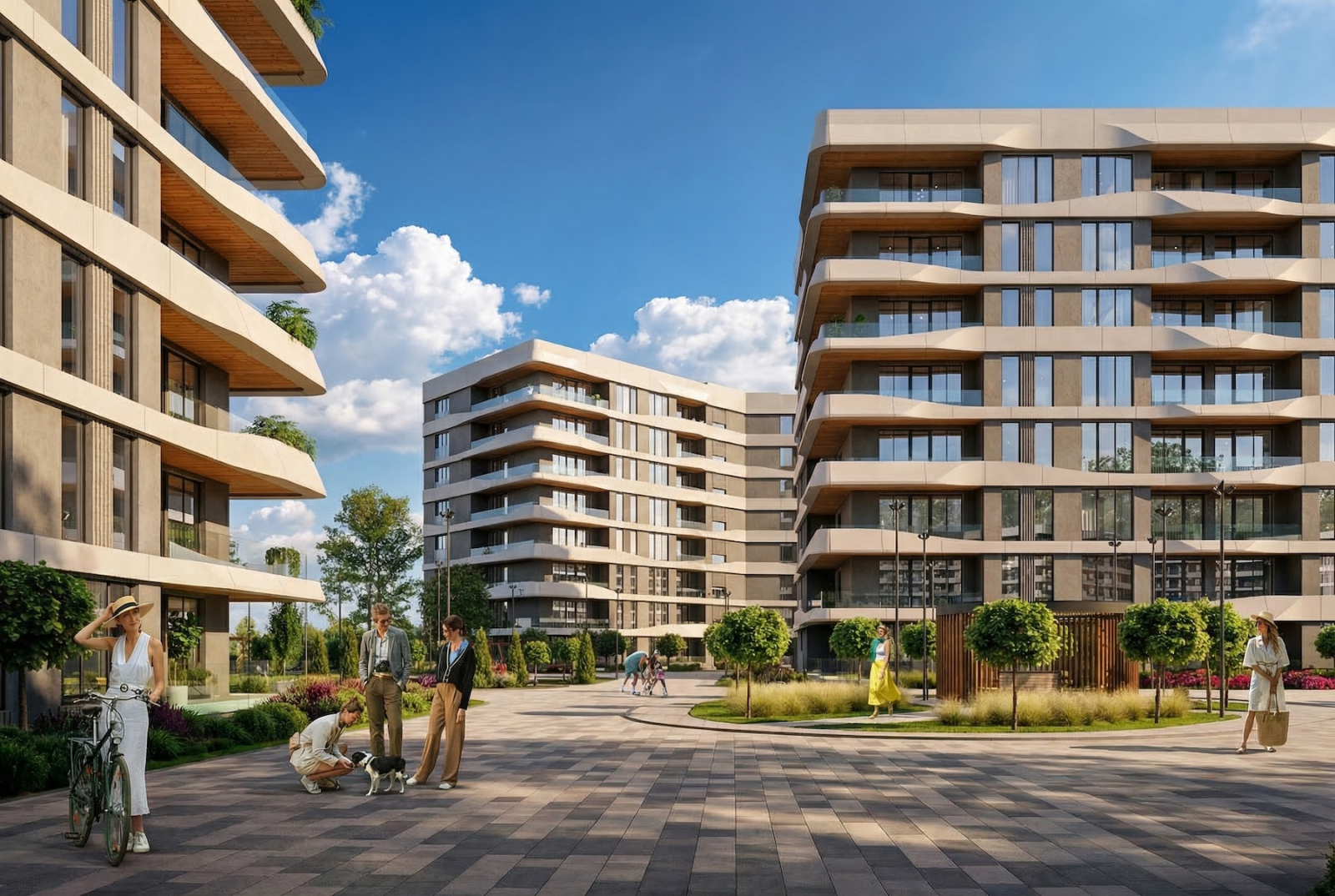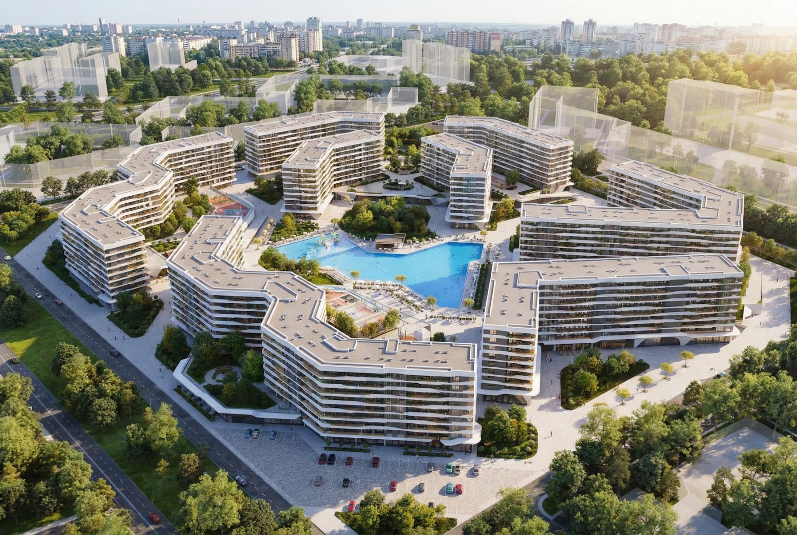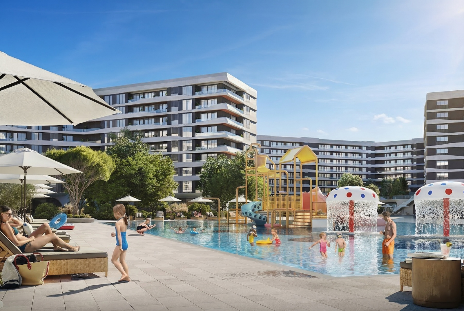 На территории всё как надо: взрослый бассейн — для амбиций и фитнеса, детский — для уточек и веселых семейных хроник. Корпуса девятиэтажные: ни депрессивная хрущёвочка, ни филиал Москва-Сити, без вкуса к безумию, зато с нормальным видом — чтоб фотографиям в соцсетях завидовали даже карьерные консультанты.