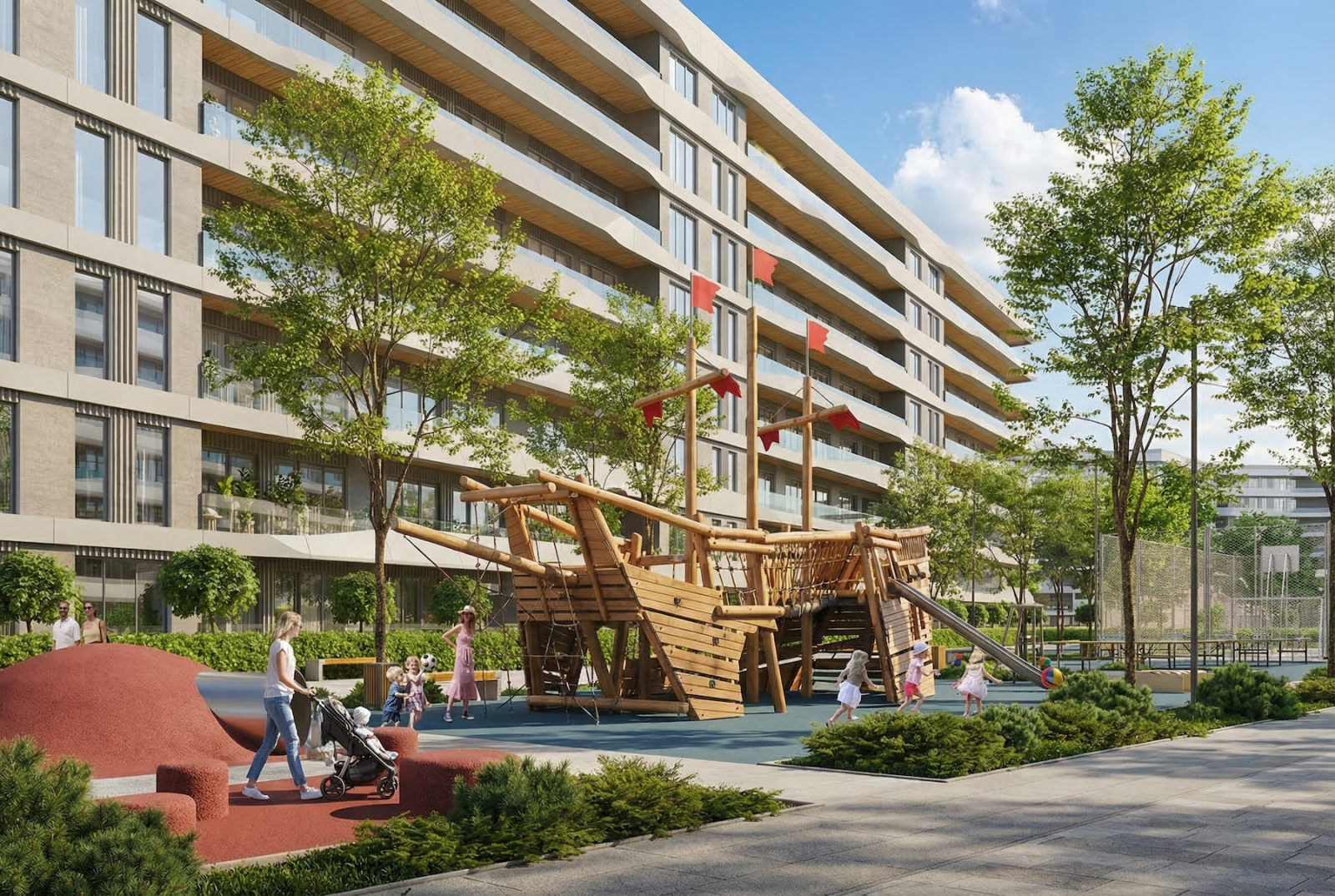 Дети? Площадки. Родители с детьми? Тоже площадки. Автомобили — выдохните: паркинг и внизу, и наверху. Железных коней постережём от солнечных ожогов.