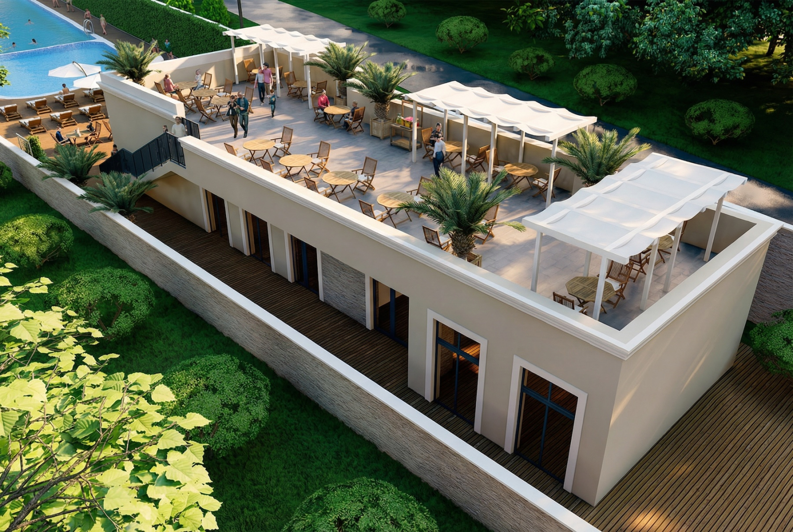 Бассейн открытый — чтобы не чувствовать себя героем зарубежных путёвок, а плавать, отдыхать и немного ощущать себя человеком. Спортплощадка — для тех, кто вдруг вспомнил о мускулах, а не только про отпуск. Детская площадка — чтобы понять, сколько у детей силы и почему тебе нужен отдых. Кафе с террасой — вариант для честных: сидим, смотрим на закат, отдыхающих и ловим дзен, наблюдая за теми, кто всё-таки решил экономить на креме от загара и теперь сияет правильным красным цветом.