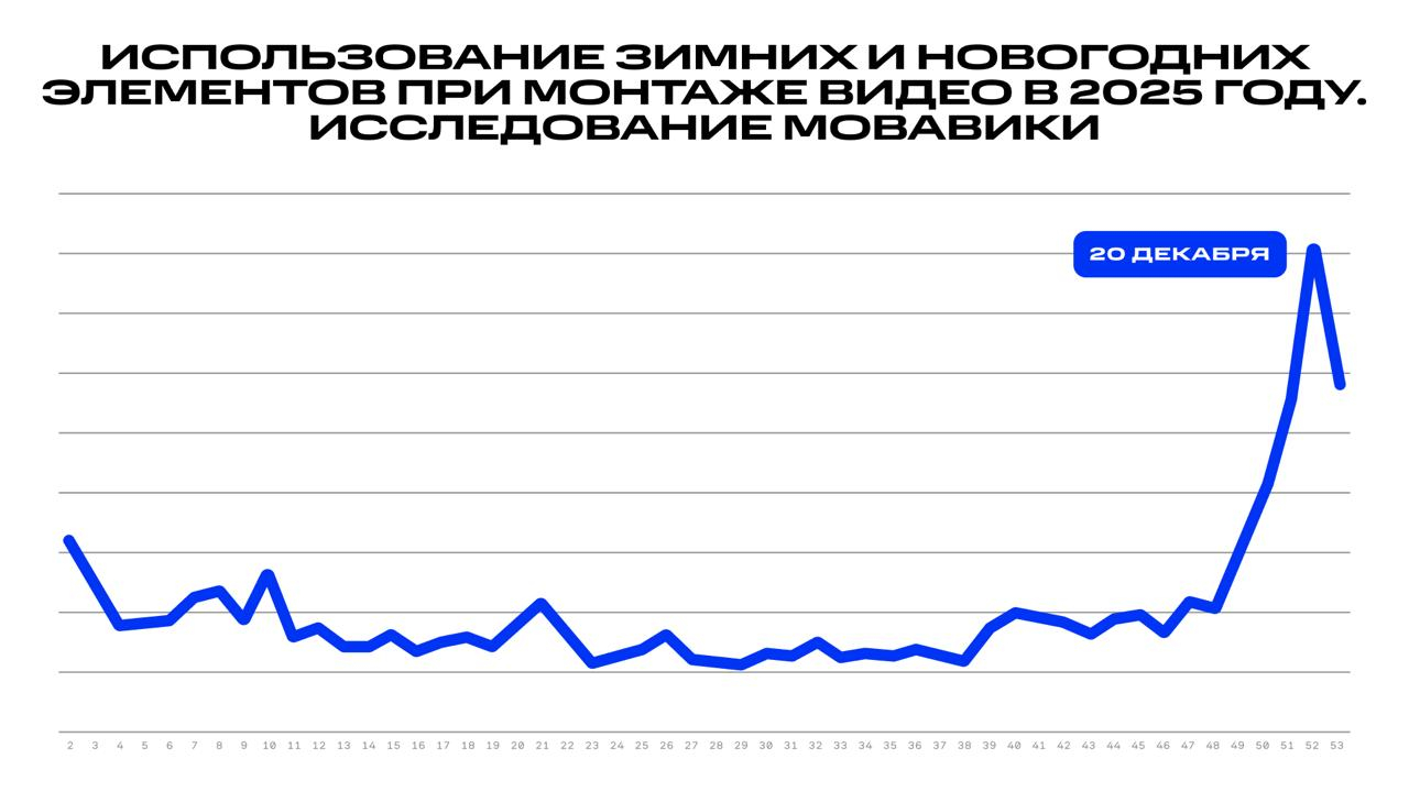 Российская компания «Мовавика» изучила, как часто пользователи оформляют ролики с зимней и новогодней атрибутикой. Аналитики опирались на данные по нескольким сотням тысяч видео, созданных за последний год.
