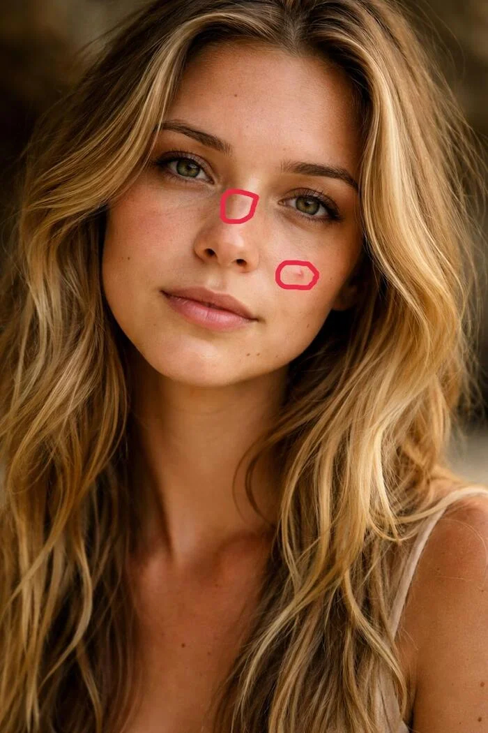 Все существующие маски и фильтры легко заметить. А что если вы хотите убрать какие-то временные изъяны так, чтобы никто не заметил? Например, убрать небольшие прыщики на лице. Загружаем в нейросеть и обводим их. Я, например, обвожу с помощью встроенного в Telegram редактора.