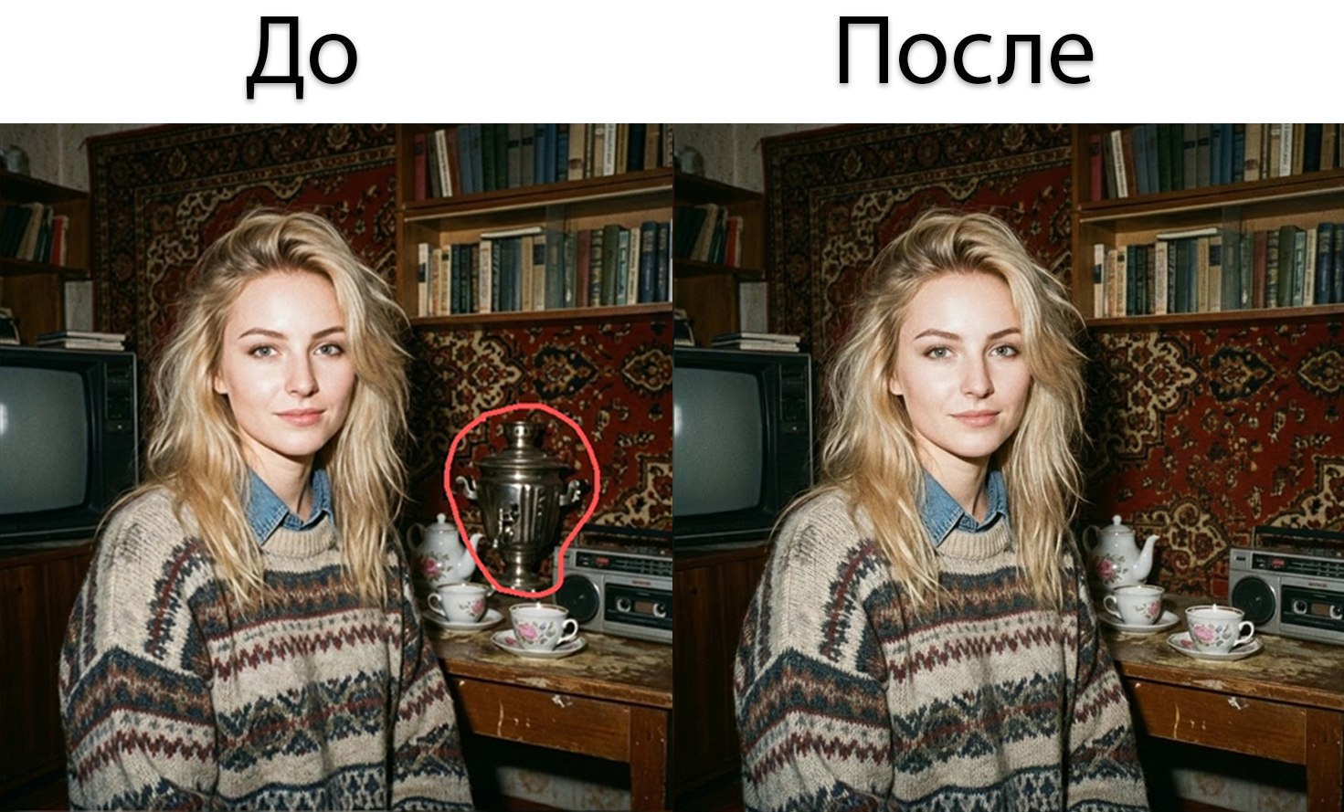 Еще одна крутая функция - удаление объектов с помощью нейросети. Редактор позволяет либо примерно обвести удаляемый объект, либо описать его текстом. Причем, нейросеть не только вырезает объект, но и заполняет все пространство за ним с учетом окружения так, что догадаться о работе нейросети невозможно.