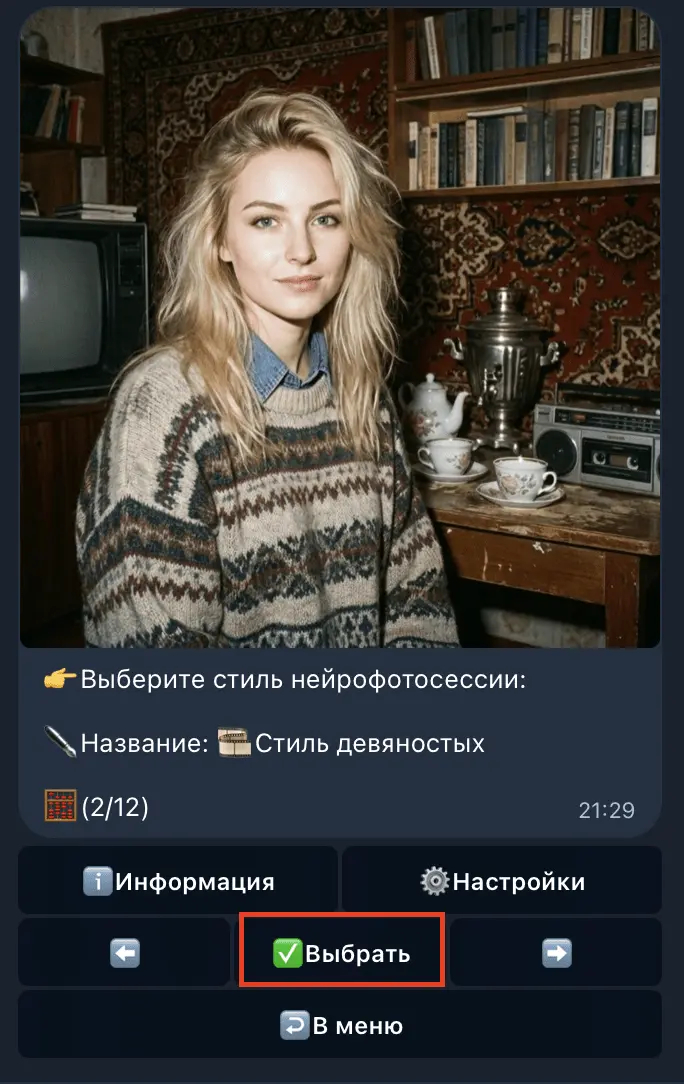 4. Выберите стиль нейрофотосессии листая их с помощью стрелочек, а потом нажмите "Выбрать".
