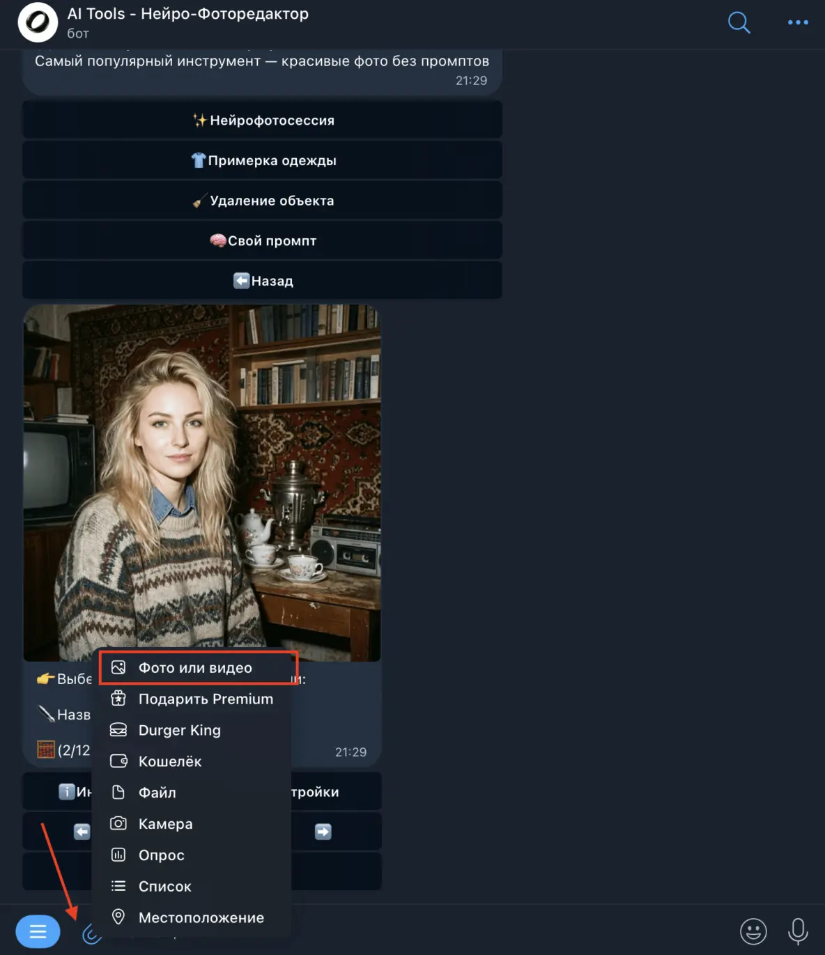 5. Бот запросит фотографию - пришлите ему свою фотографию, где хорошо видно лицо. Сделайте это как обычно - нажмите на скрепку снизу, после чего выберите "Фото или видео", и выберите из галереи нужную фото.