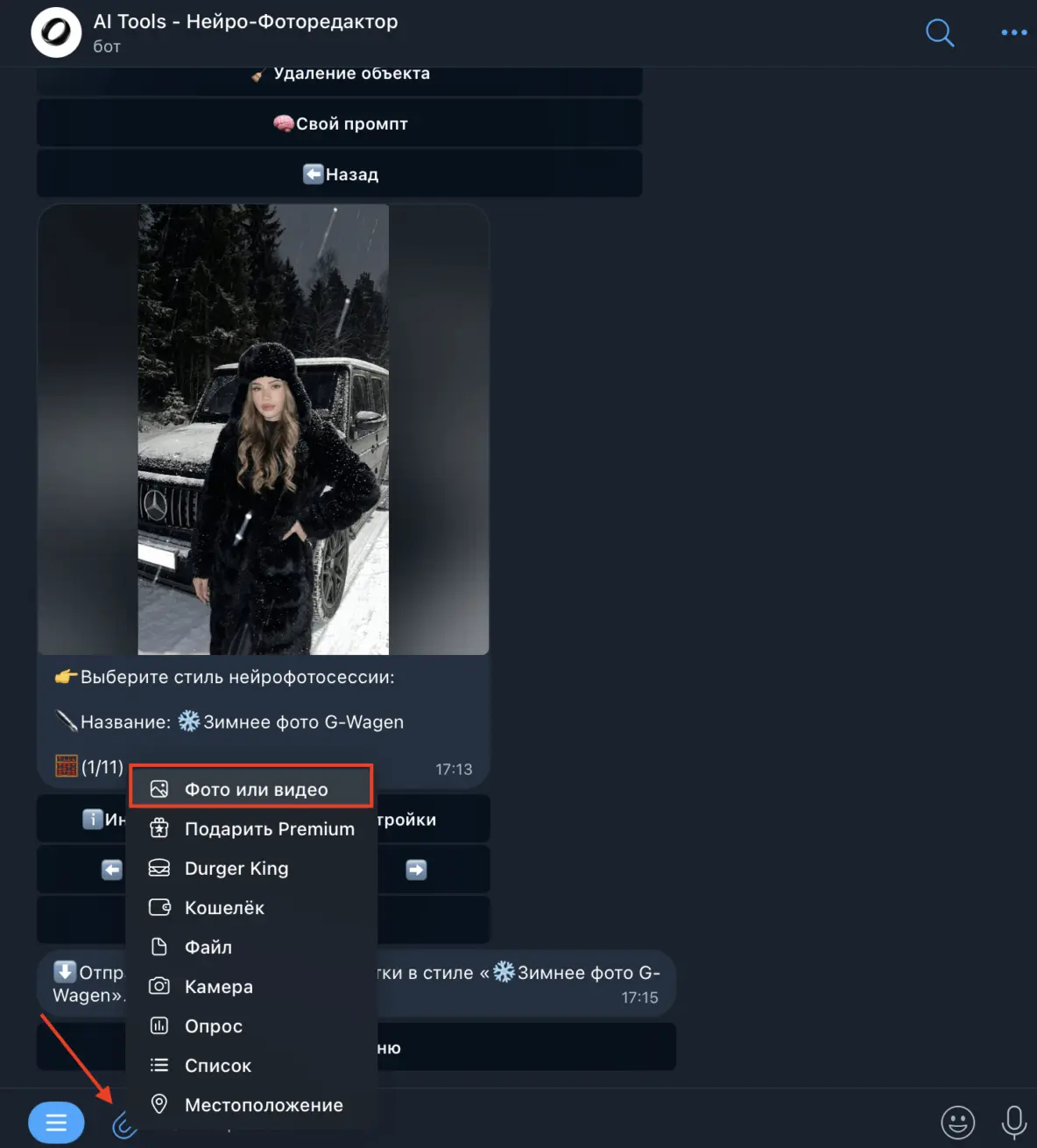 5. Бот запросит фотографию - пришлите ему свою фотографию, где хорошо видно лицо. Сделайте это как обычно - нажмите на скрепку снизу, после чего выберите "Фото или видео", и выберите из галереи нужную фото.