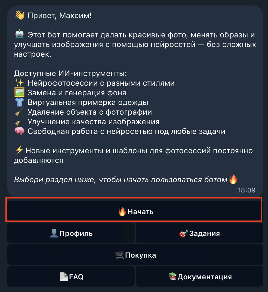 1. Заходим в бота по ссылке: https://t.me/AIToolsTelegramBot, либо вводим в поиске Телеграма: AIToolsTelegramBot