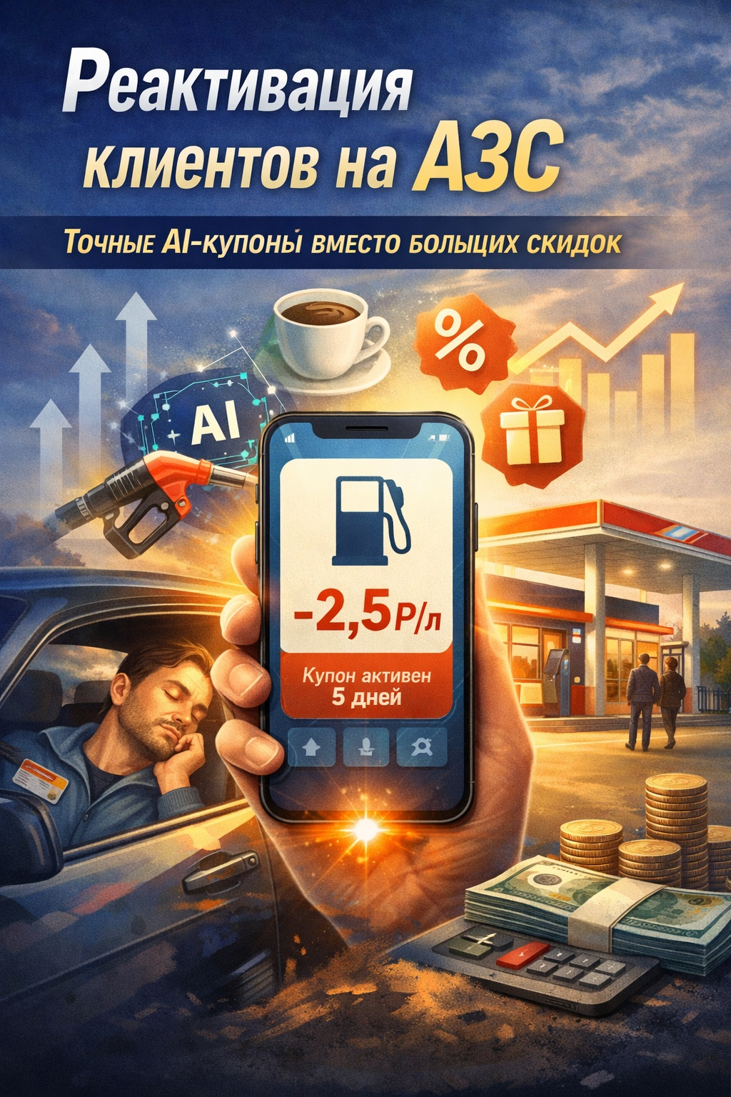 Механика: Персональный купон на фиксированную выгоду (в рублях или процентах), который активируется только при заправке от определённого количества литров и в ограниченное «окно» (5–7 дней). Система может назначать более выгодный купон тем, у кого выше вероятность вернуться и без глубокой скидки.