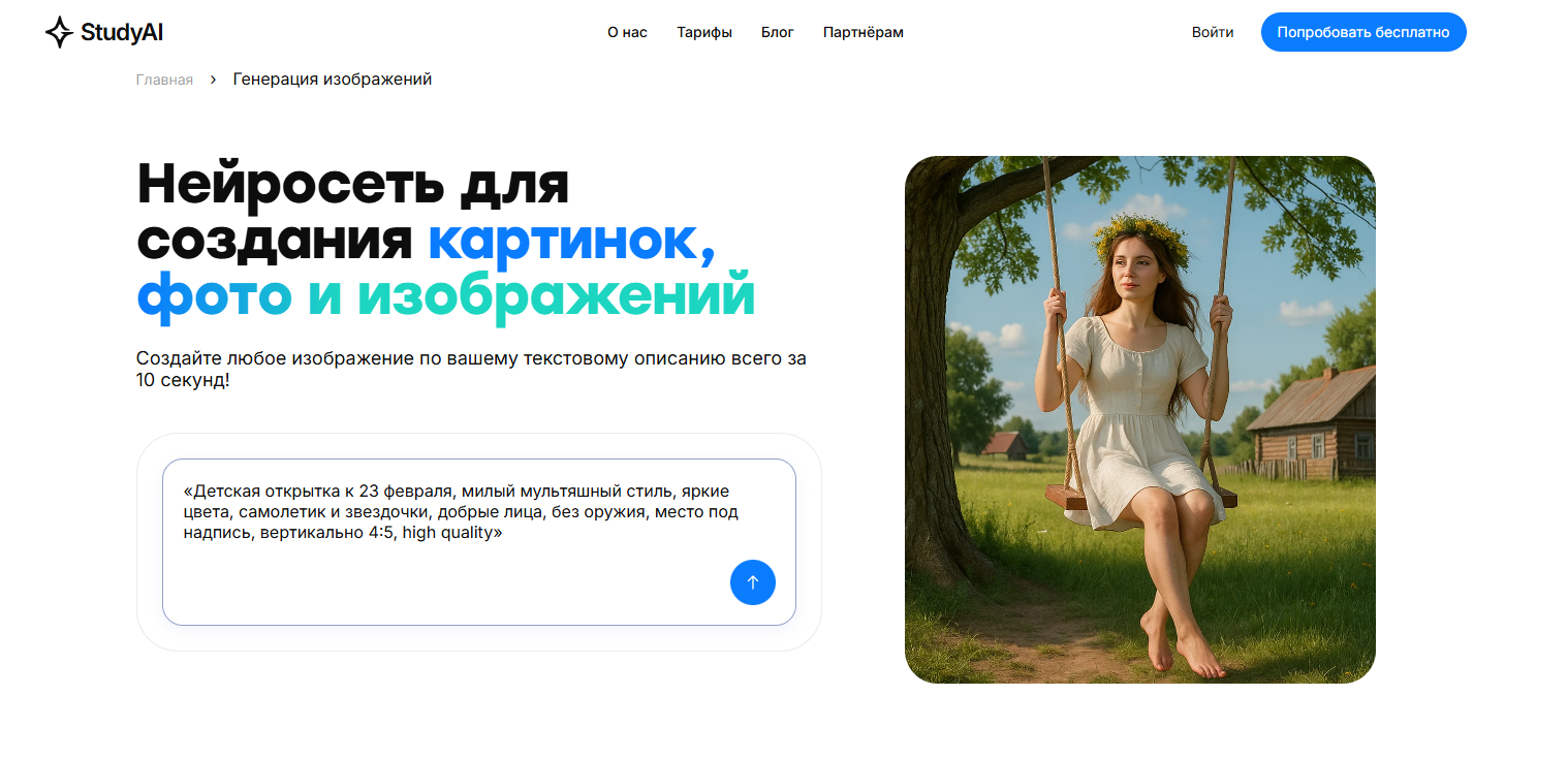 Самый надежный способ: генерировать картинку без текста, а надпись добавить уже в редакторе/конструкторе. Если все же хотите текст сразу — пишите «надпись на русском, крупно, без ошибок, простая гарнитура», но будьте готовы к 2–3 попыткам.