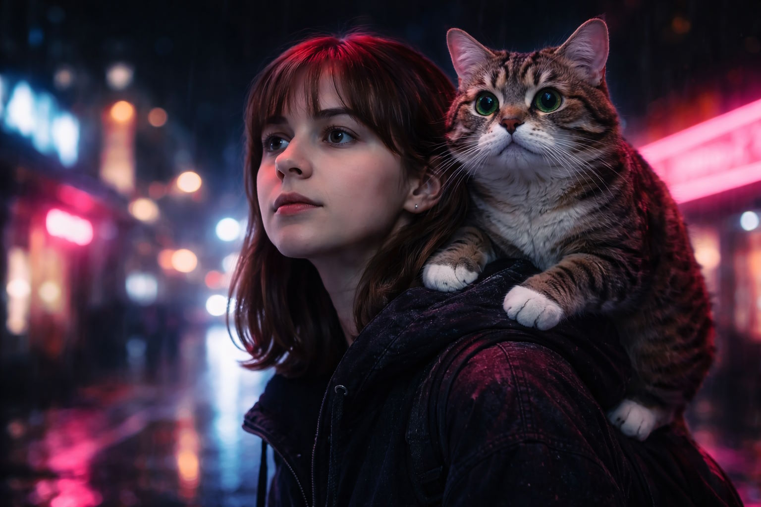 Ночная улица Токио будущего, неон отражается в лужах, дождь стучит по зонту, а на руках у вас сидит изящный киберкот: глянцевый металл, светящиеся провода, объективы вместо глаз. Не живой, но невероятно обаятельный. Референс: фото человека.
