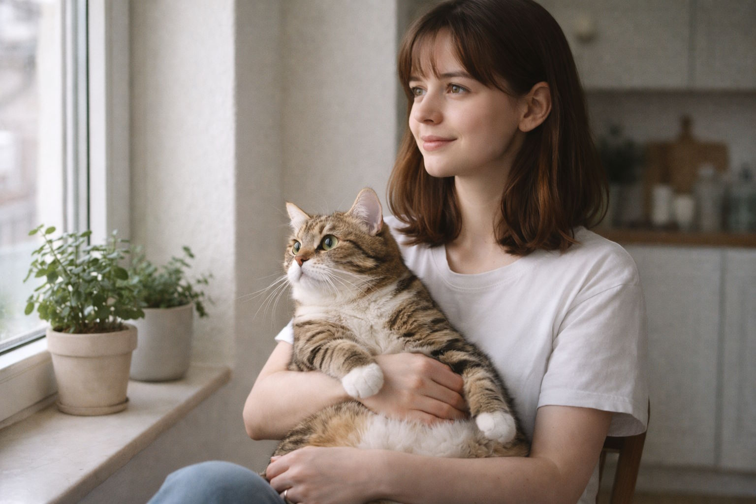 Тихое утро, мягкий свет из окна, кот на руках и атмосфера полного покоя. Промпт создает нежную, почти пленочную фотографию с вами и вашим питомцем. Референсы: фото человека + фото кота.