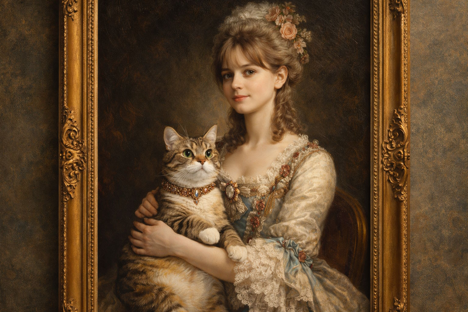 Представьте себя на классической картине маслом: богатые ткани, кружева, золоченая рама — и ваш кот в роли любимца эпохи. Промпт создает живописный портрет в стиле барокко с максимальной передачей сходства. Референсы: фото человека + фото кота.