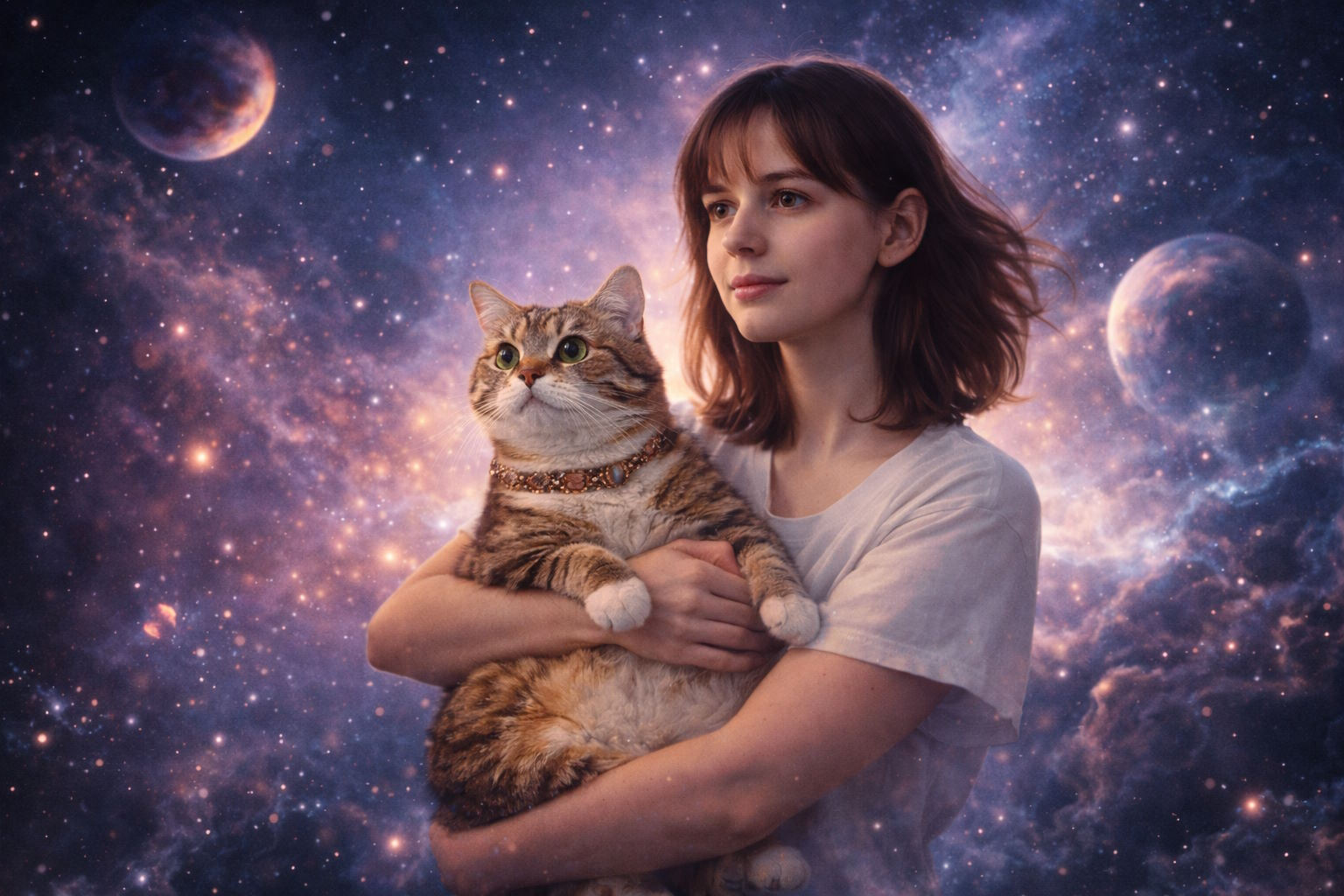 Фантазийная и нежная сцена: вы и ваш питомец парите в открытом космосе среди туманностей и планет — реалистичные, узнаваемые, окруженные мягким свечением. Референсы: фото человека + фото кота.