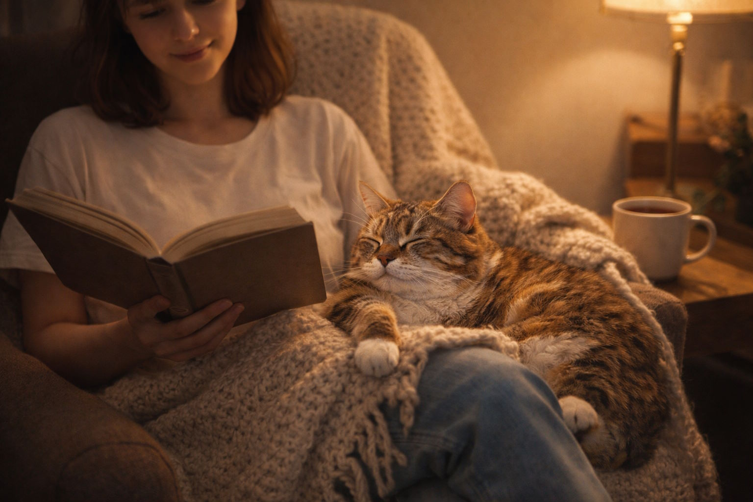 Теплая уютная фотография в интерьере. Человек с референса, с узнаваемыми чертами лица, сидит в мягком кресле с книгой в руках. На коленях у него свернулся клубком кот, внешность которого строго воспроизведена с референса: точный окрас, рисунок шерсти, форма мордочки. Питомец выглядит абсолютно расслабленным и умиротворенным: глаза закрыты, мордочка выражает блаженство. Тело животного тяжелое и теплое, плотно устроившееся на коленях. Одна лапка мягко свисает вниз. Текстура шерсти хорошо освещена теплым светом от торшера сбоку. Атмосфера хюгге: вязаный плед на кресле, чашка чая на деревянном столике рядом, мягкий полумрак вокруг. Глубина резкости, фокус на коте и руках человека, мягкое боке на фоне. Запрещается: агрессивный или напряженный кот, открытые глаза кота, неправильный окрас или рисунок шерсти, холодный свет, офисная или уличная обстановка, искаженные пропорции тела, размытая шерсть, лишние хвосты или лапы, водяной знак, текст, артефакты.