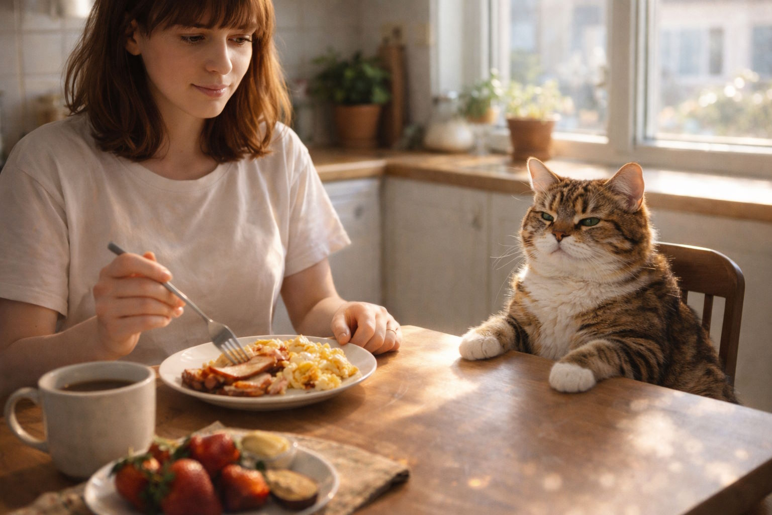 Лайфстайл-фотография на кухне, утренняя сцена. За столом напротив человека с референса, с узнаваемыми чертами лица, сидит кот, внешность которого строго воспроизведена с референса: точный окрас, рисунок шерсти, характерные особенности мордочки. Питомец сидит на стуле как человек — вертикально, спиной к спинке стула, передние лапы лежат на столешнице. Тело животного анатомически корректно, лапы не сливаются со столом. Выражение морды требовательное и нагловатое, взгляд пристально устремлен на тарелку человека. Кот ухоженный и пушистый. Утренний солнечный свет из окна падает на стол, создавая красивые блики на шерсти, посуде и поверхностях. Высокая детализация текстур еды, шерсти и фактуры кухонных поверхностей. Запрещается: кот на полу или на столешнице, кот спиной к зрителю, измененный окрас или рисунок шерсти, грязная или захламленная кухня, искусственный или холодный свет, деформированные лапы, слияние кота со столом или стулом, низкое качество текстур, мультяшность, водяной знак, текст.